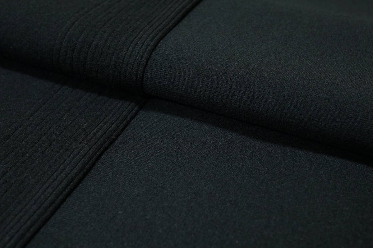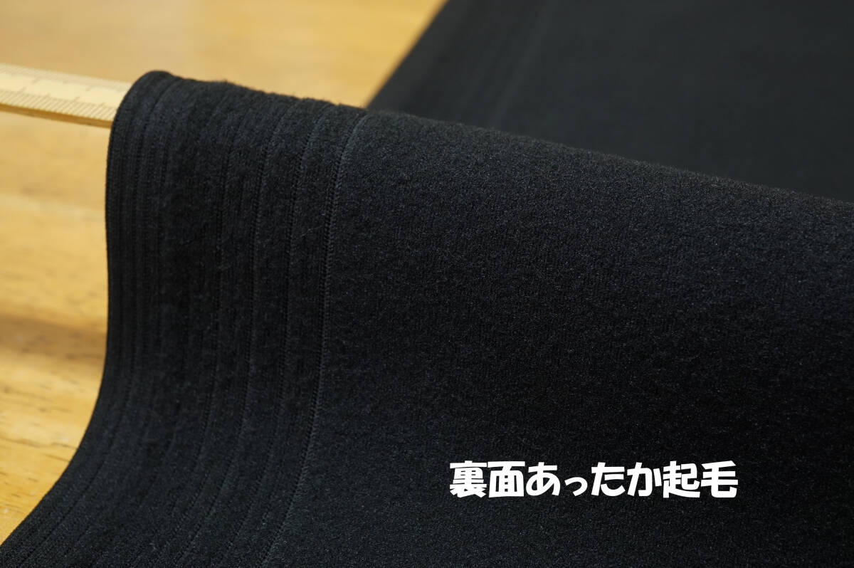 ポリエステル・ポリウレタン混、厚さは中厚地、2way伸縮のソフトな風合いで、表はサラサラ感、裏は暖かい起毛仕様でございます。