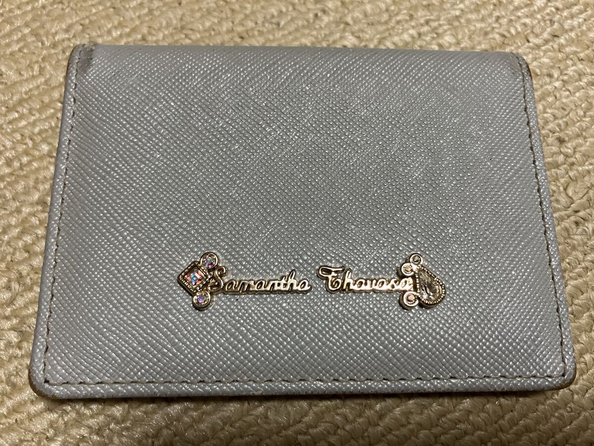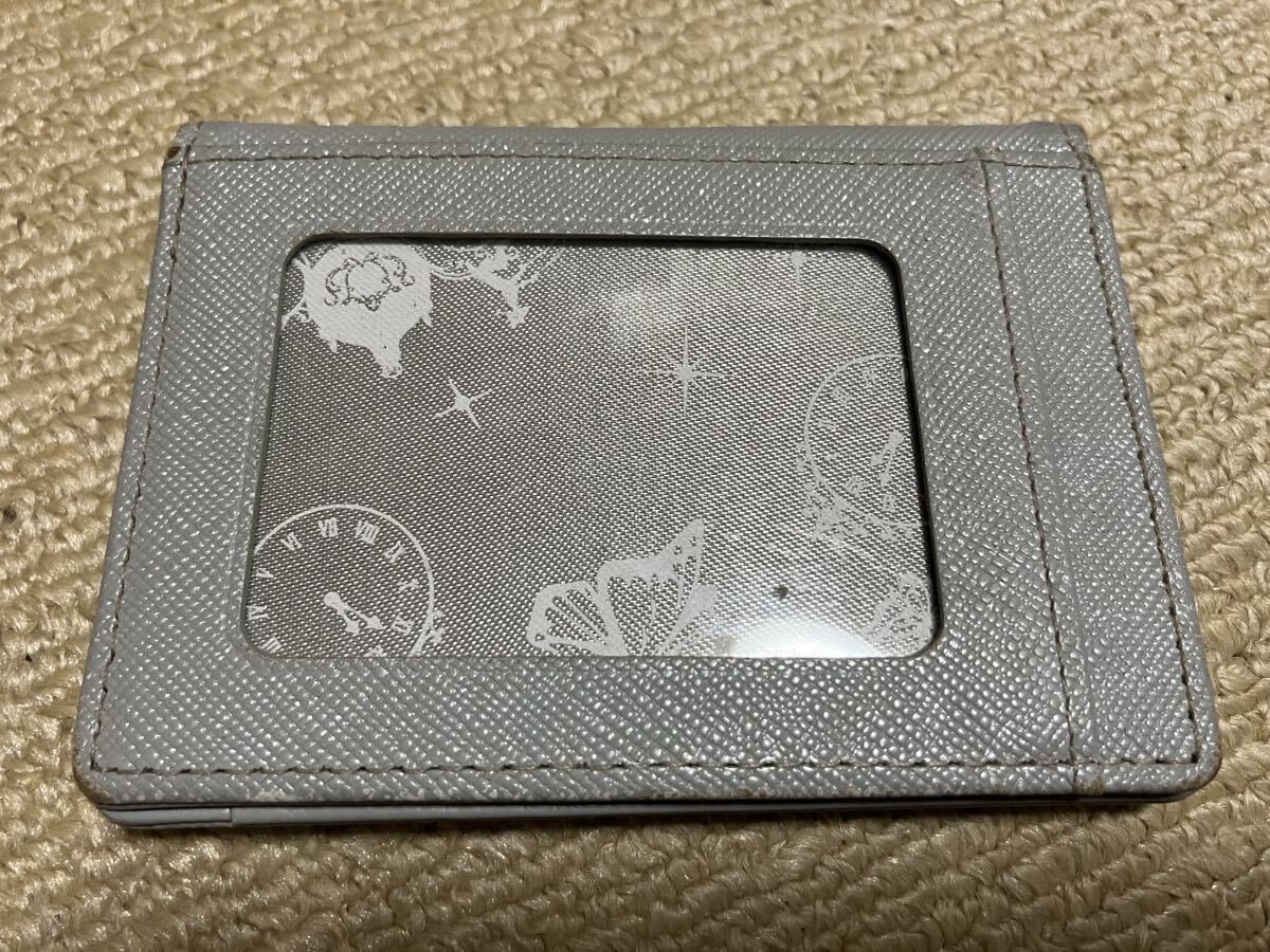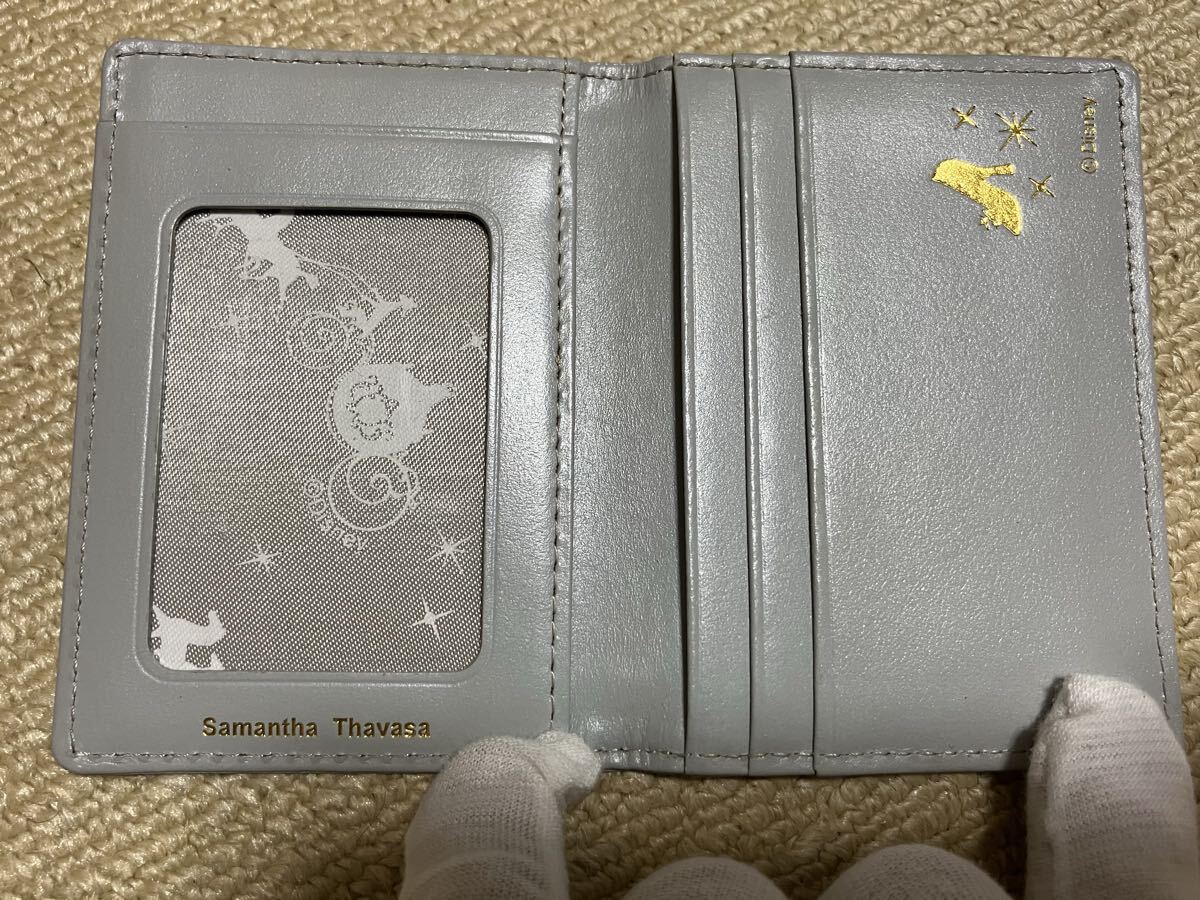 グレーのSamantha Thavasa製 シンデレラ コラボパスケース、透明ポケットと星のデザイン付き。 - ブランド: Samantha Thavasa - カラー: グレー - デザイン: 透明ポケット付き - 内側デザイン: 星と動物のプリント - 金具: ゴールドのロゴプレート
