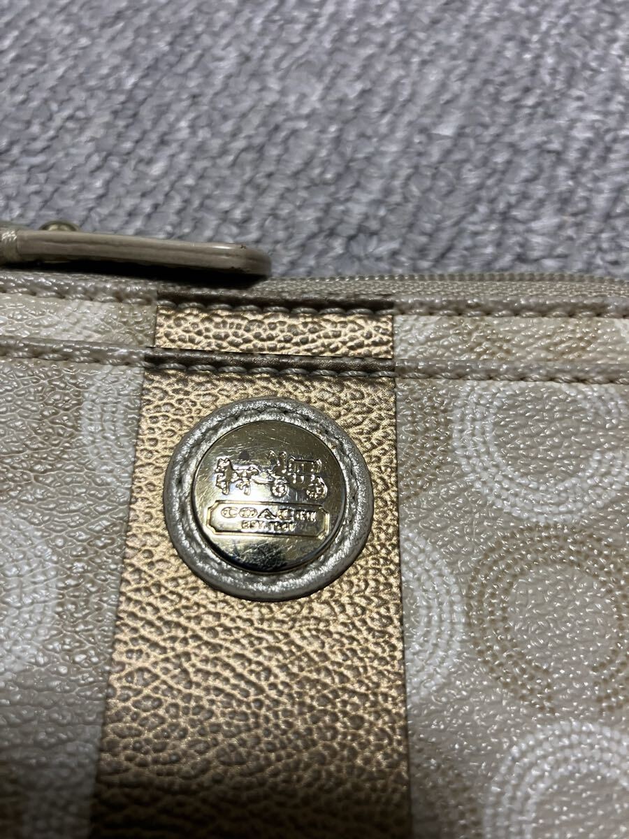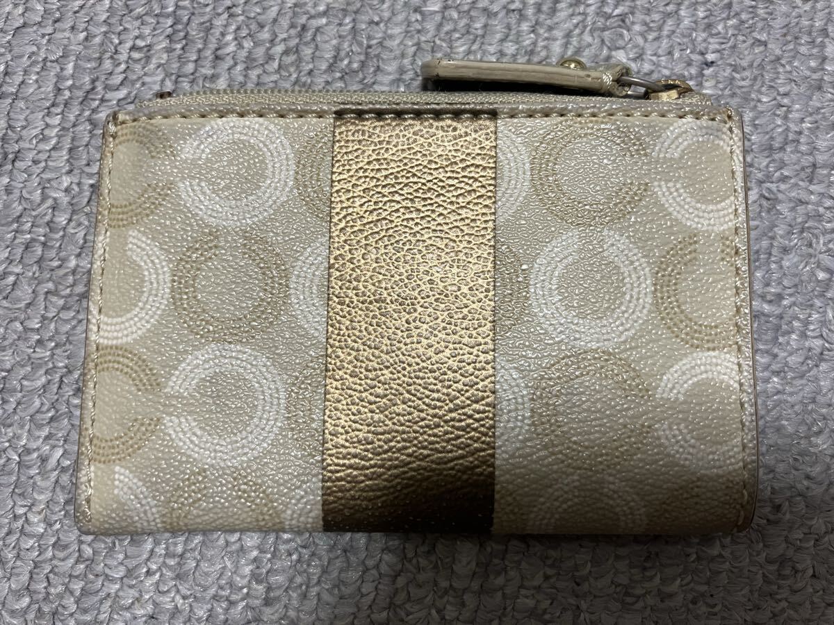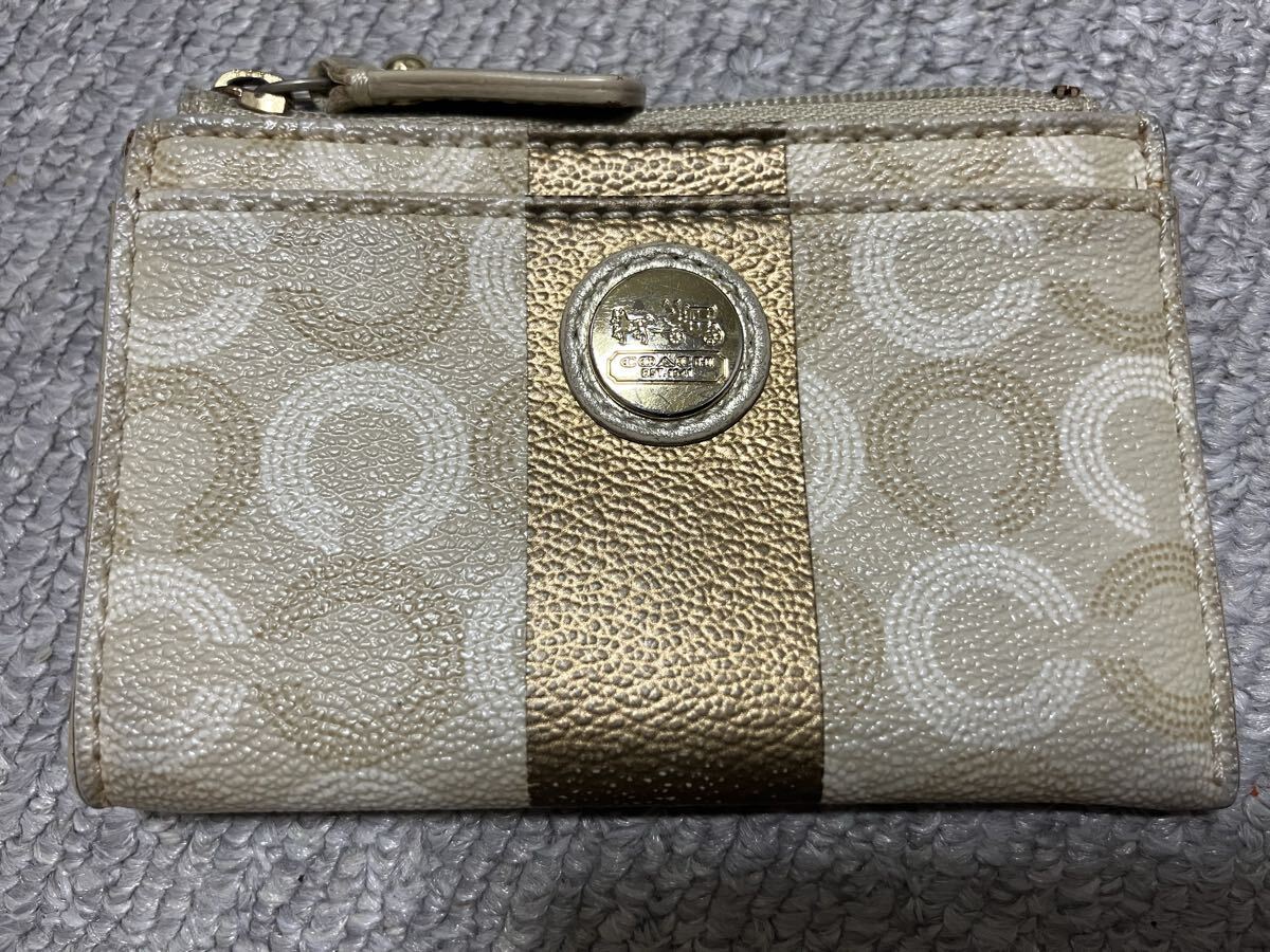 ベージュのレザー製コインケース、Coachのロゴ入り。 - ブランド: Coach - 色: ベージュ - 素材: レザー - デザイン: ロゴ入り、ストライプ - ロゴ: Coachのメタルロゴ - スタイル: コインケース