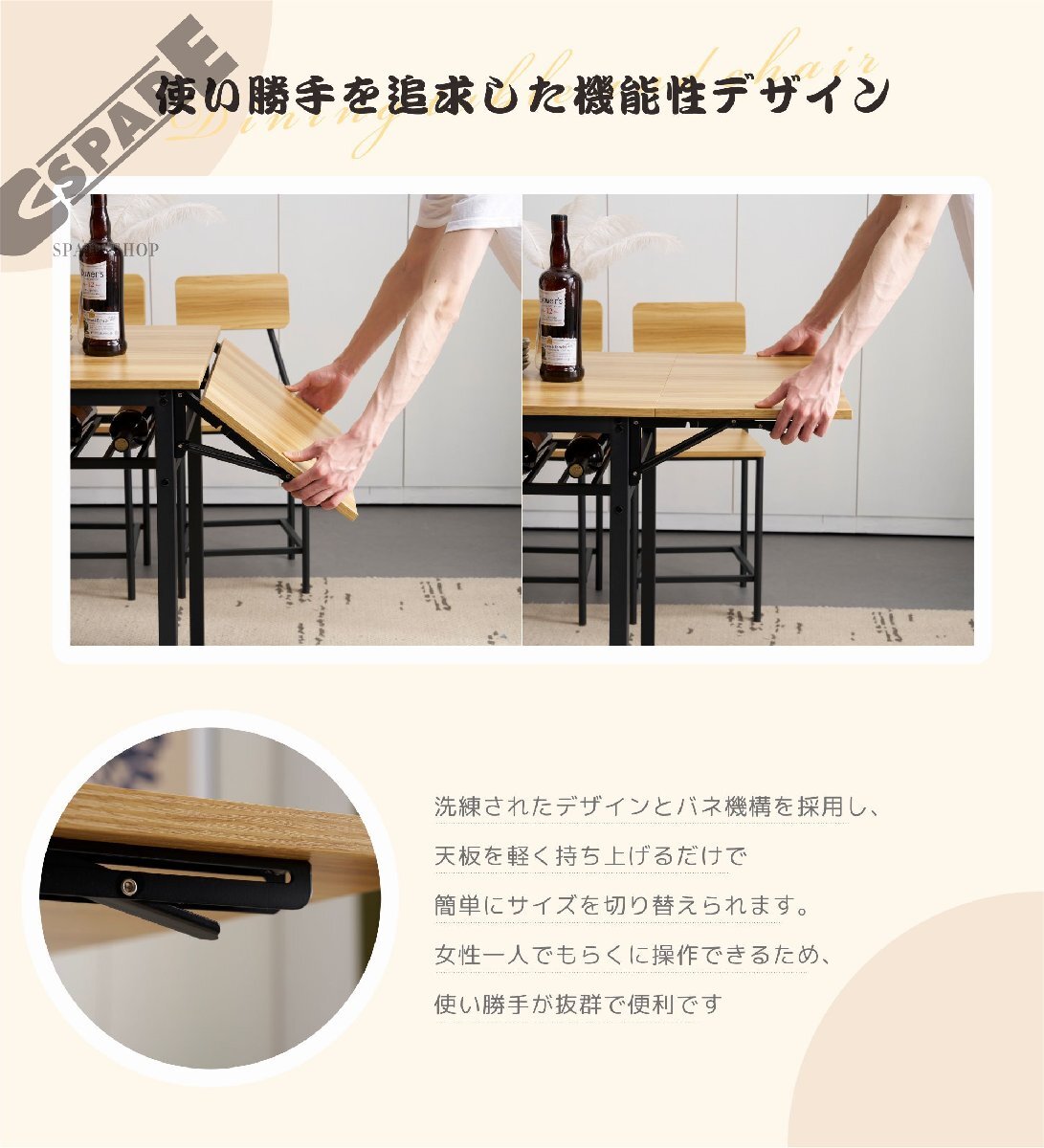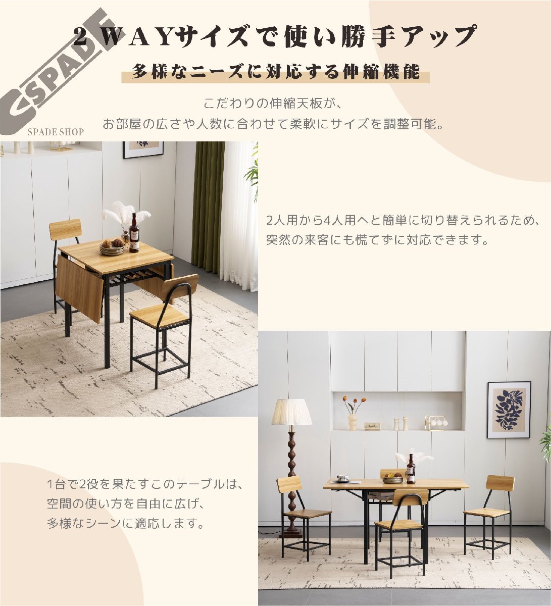 • 【2 WAYサイズで使い勝手アップ】こだわりの伸縮天板が、お部屋の広さや人数に合わせて柔軟にサイズを調整可能。2人用から4人用へと簡単に切り替えられるため、突然の来客にも慌てずに対応できます。