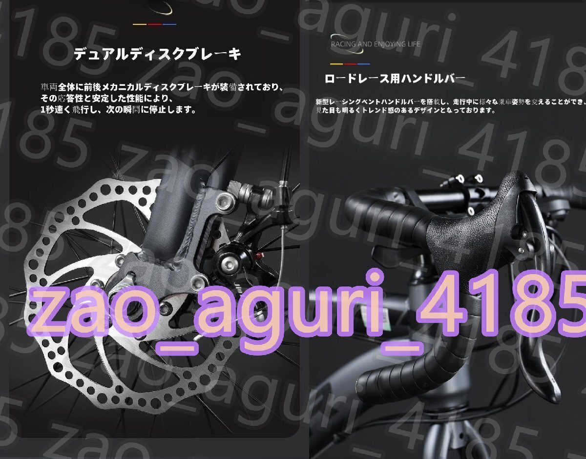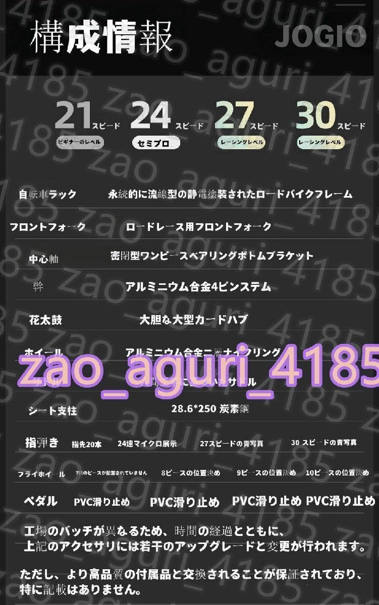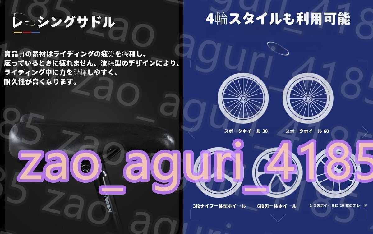 ベアリング密封されたボトムブラケット走行時の重要な伝達部品であるボトムブラケットは、ボールに比べて摩擦が少ない合理的な構造で、日常のメンテナンスを軽減します。 | レーシングサドル高品質の素材はライディングの疲労を軽減し、座っているときに疲れません。合理的なデザインにより、ライディング中に力を発揮しやすく、耐久性が高くなります。 | ロードレース用ハンドルバー新型レーシングベントハンドルバーを搭載し、走行中に様々な乗車姿勢を変えることができ、見た目も明るくトレンド感のあるデザインとなっております。 |