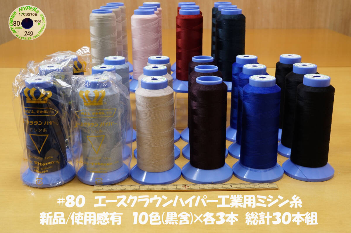 新品未使用品と使用感有 #80エースクラウン・ハイパー工業糸、新品時:1本3000m巻仕様の10色(黒含)×各3本・総計30本1セットでの出品でございます。