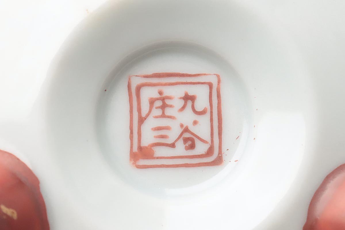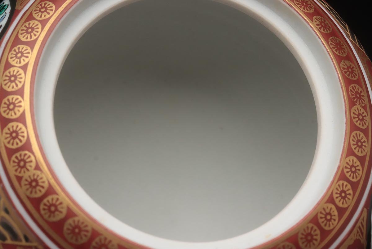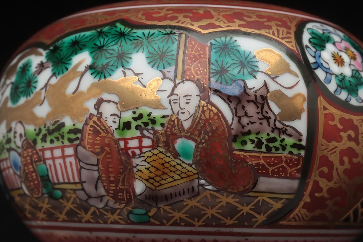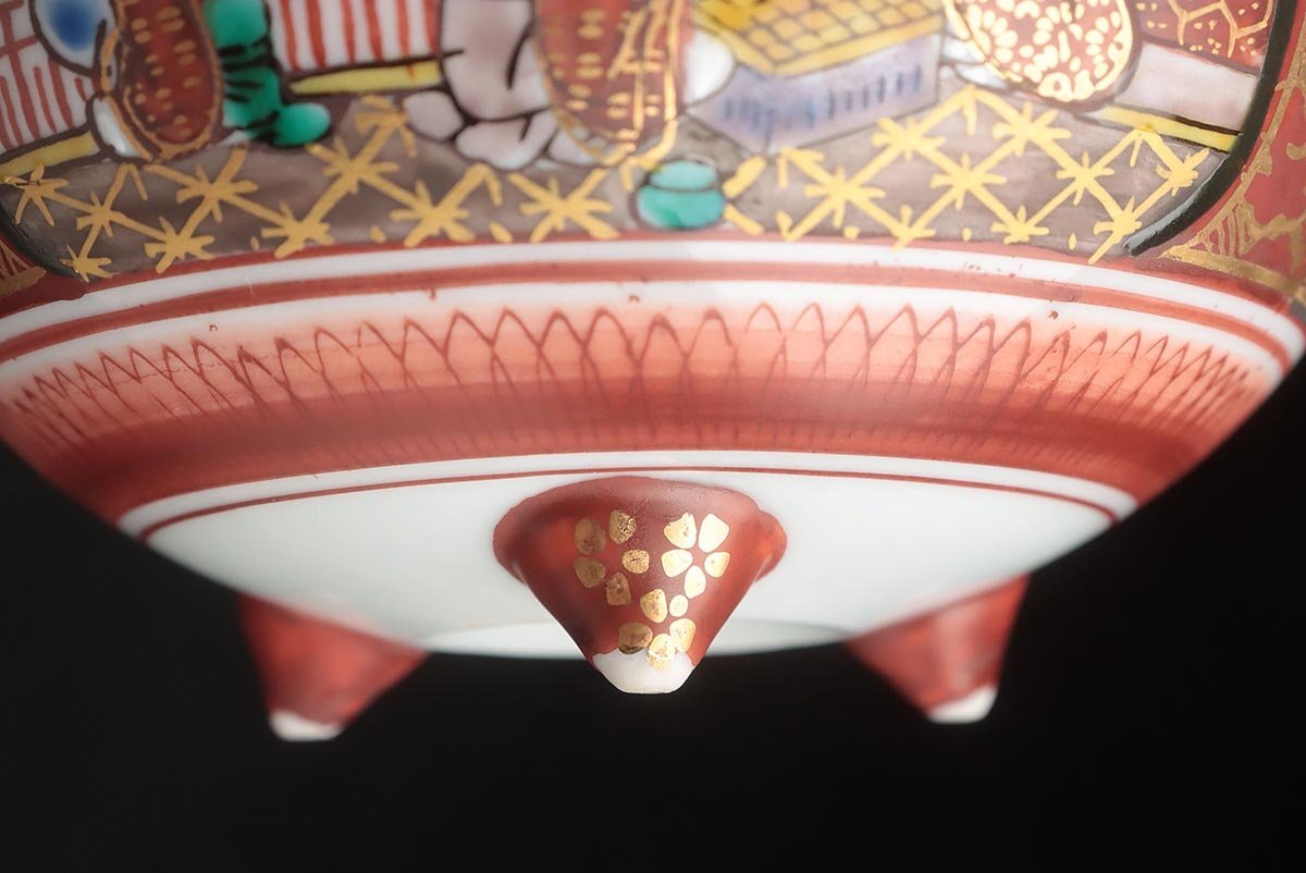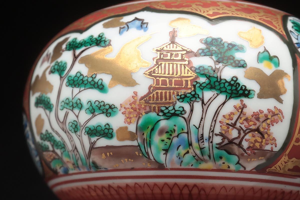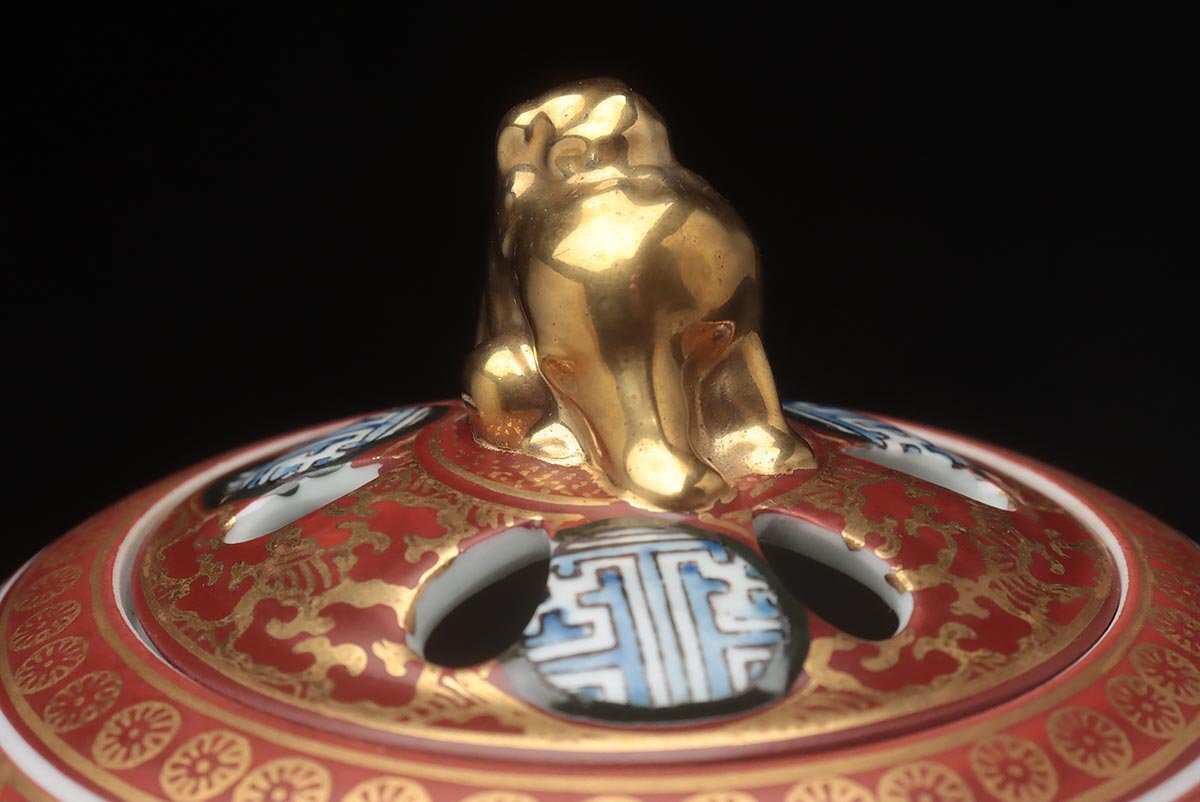 | ◆ 【永泉堂 庄三造】九谷 赤絵金彩 獅摘 楼閣山水人物図 三足 丸形香炉 高12cm 共箱附・九谷香爐 茶道具 ◆