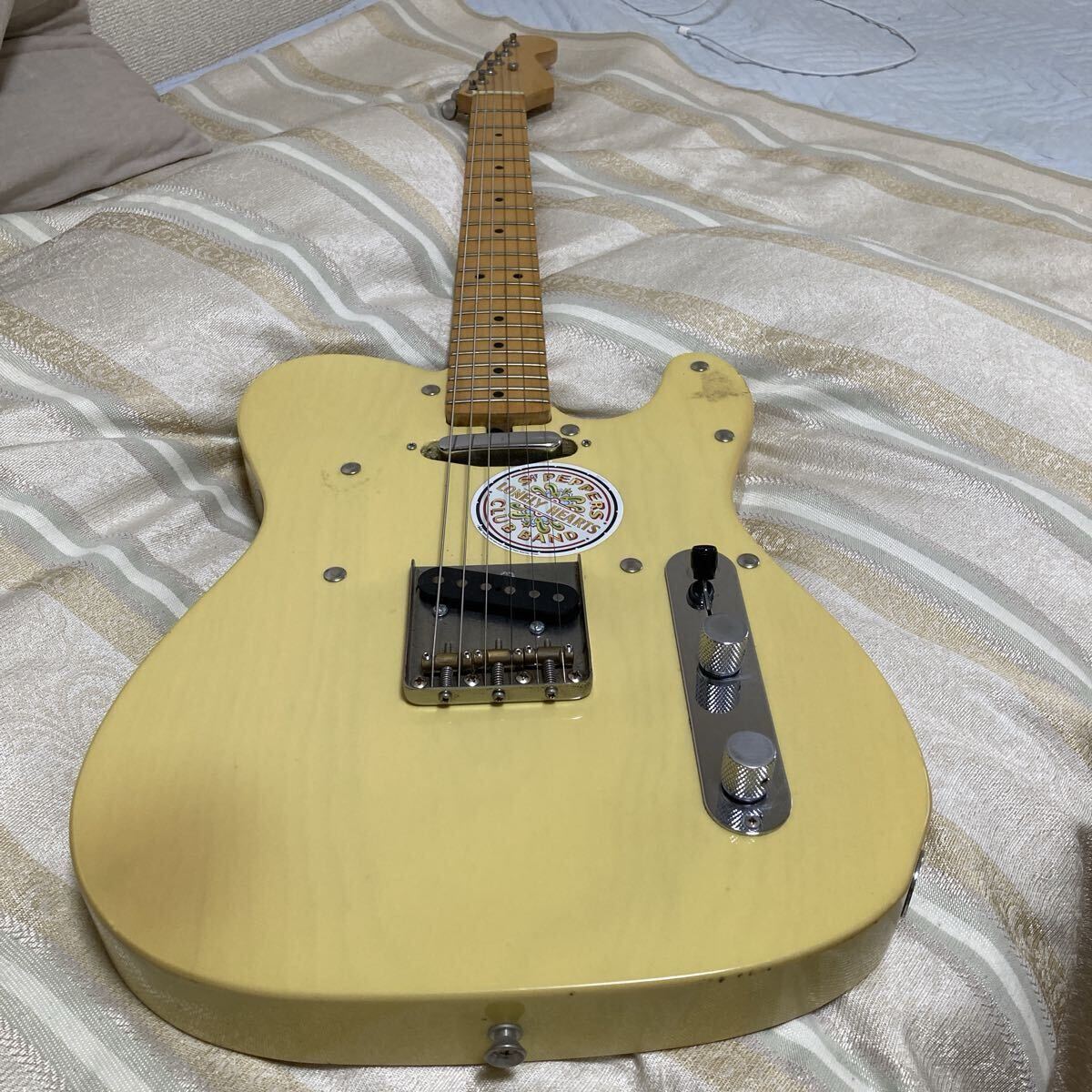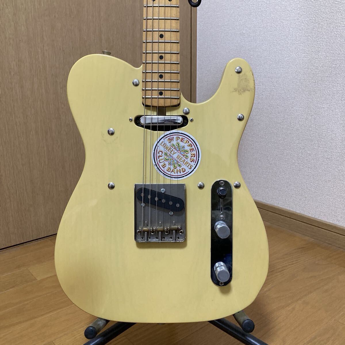 TOKAIのテレキャスターのボディ、ピックアップ等アッセンブリーに極太のネックを付け替えたモノです。ナット幅42ミリ。現在低弦高を保ちつつ、ビビりなし。ロッドは回したことがないので余裕不明ですが、問題ないと思います。ピックガードははずし、写真の通りの仕様にしています。配線の見える部分にはサージェントペパーズのステッカー貼り。ボディのツノの部分に塗装割れ有り。その部分にステッカーを剥いだ跡あり。その他小傷や肘を置く部分に変色あり。音出しは問題なくテレらしい音がしています。この様に傷もあり、独特の仕様ですが、いい雰囲気のテレではないかなと思います。