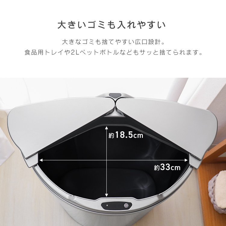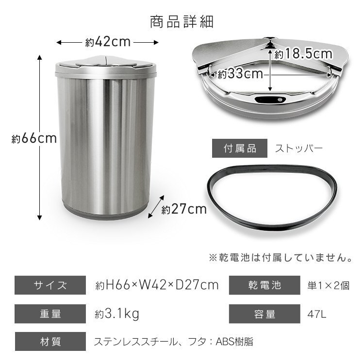 | とっても便利!センサーでフタが自動開閉! 手をかざすとセンサーが感知してフタが開きます。 直接手を触れずに開けられるので、とっても衛生的です! 台所はもちろんのこと、赤ちゃんのおむつ捨て、医療の現場にもぴったりです! フタは横にスライドし開閉するタイプなので、カウンターやデスクの下に置いても使えます。 また、電池式なので電源を気にせず、どこにでも設定できます☆ ■商品コード:FHB006WH ■商品仕様 カラー:ホワイト 容量:47L サイズ:(約)幅42cm×奥行き27cm×高さ66cm 重量:(約)3.1kg 使用電池:単一電池×2(別売) 素材:ステンレススチール、ABS樹脂 他 ■注意事項 ・本商品には電池は付属しておりません。 ・商品は、モニターによって色合いが異なって見える場合があります。 ・仕様・デザインは改良のため予告なく変更することがあります。 ■保障期間 7日間 ※商品到着後7日以内の初期不良・破損のみご対応させていただきます。 【新品未使用品です】 |