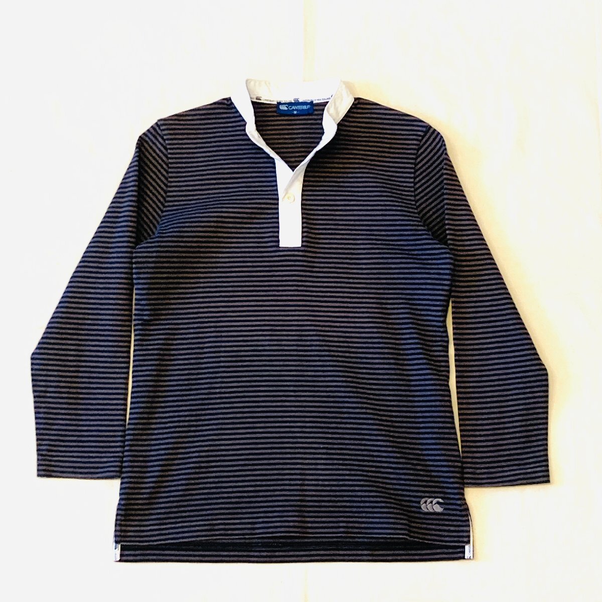 CANTERBURY カンタベリー ロゴ 刺繍 ロングスリーブ 長袖 ヘンリーネック Tシャツ ボーダー グレー/ブラック系 M