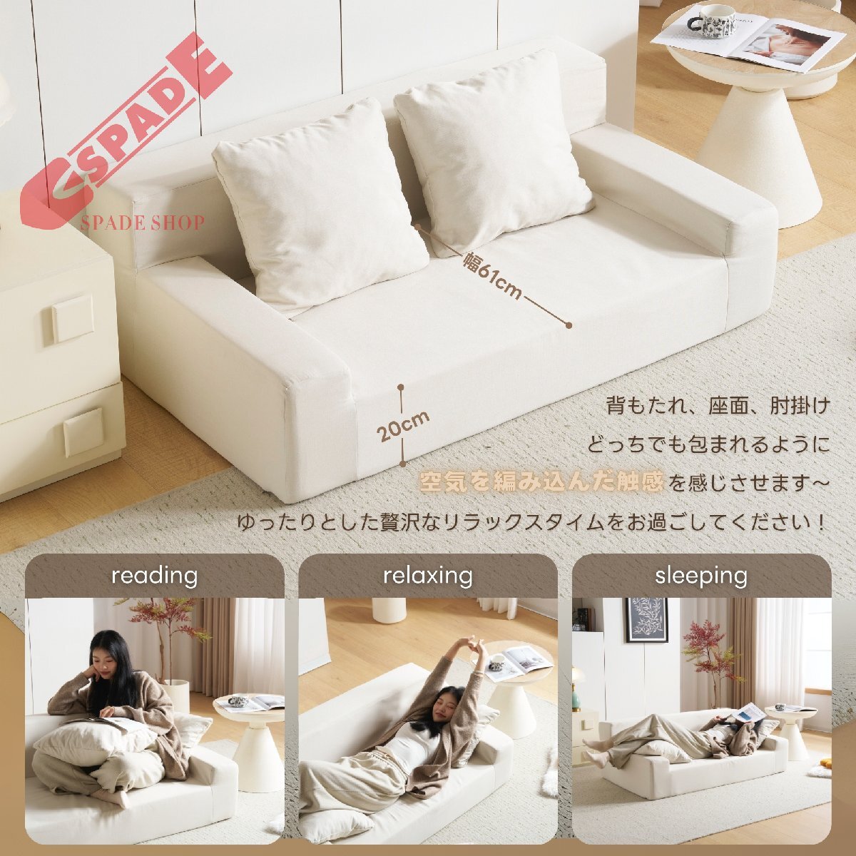 • 【ソファからベッドへの簡単変換】このソファは簡単にベッドにチェンジでき、急な来客時や休息時間に便利です。シンプルな操作で、リラックスした寝心地も提供します。二つのクッションはお昼寝の枕として使用でき、日常のリラックスやテレビ鑑賞にも腰に当てて使用できます。また読書の際の手元の高さの調整にもお使いいただけます。