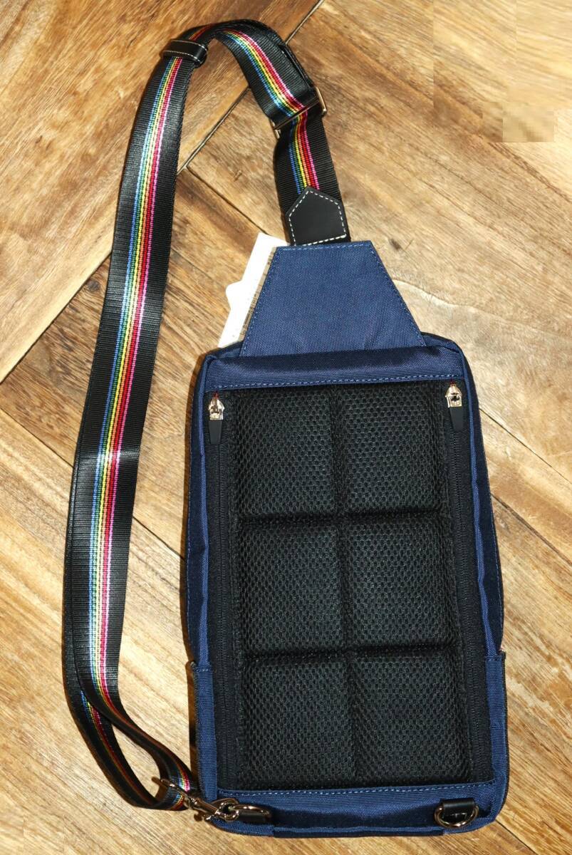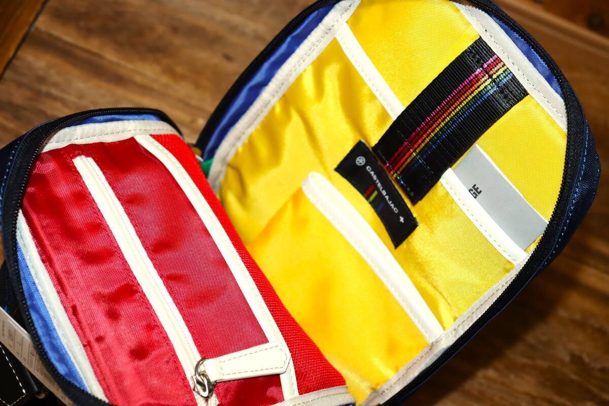 レインボーカラーのテープをポイントにしたライト感覚のユニセックストラベル。