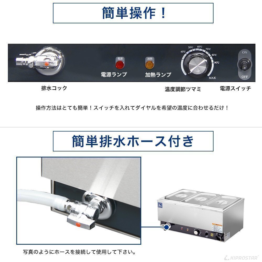 | 特長 | ・熱効率を高める特殊構造となっており、業務用フードウォーマー省エネを実現。 ・操作盤が幅が広い部分にあるワイドタイプ(横型) 【ホテルパン容量】 1/1 約20.5L、1/2 約9.0L、1/3 約5.7L、1/4 約4.2L、1/6 約2.5L **満水時の容量です** |