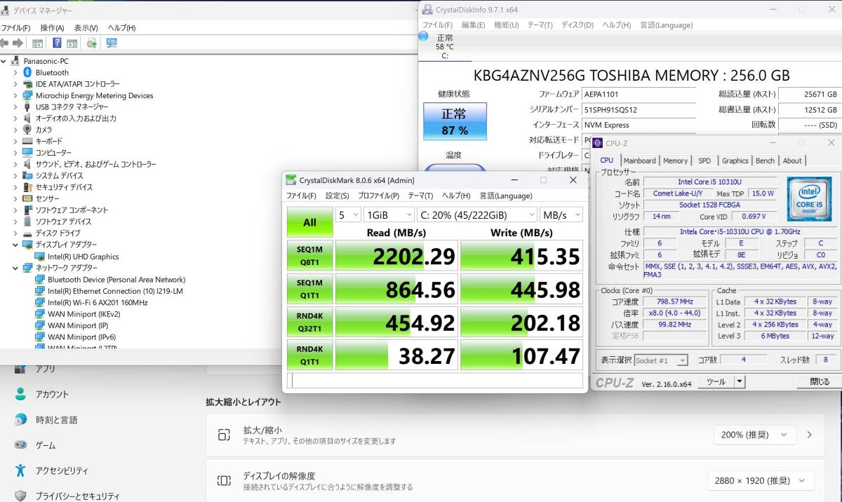 | CPU: 超高速 Intel 超高性能 第10世代Core i5-10310u 1.7Ghz、 4コア8スレッド (ターボ・ブースト利用時の最大周波数 4.4GHz) |