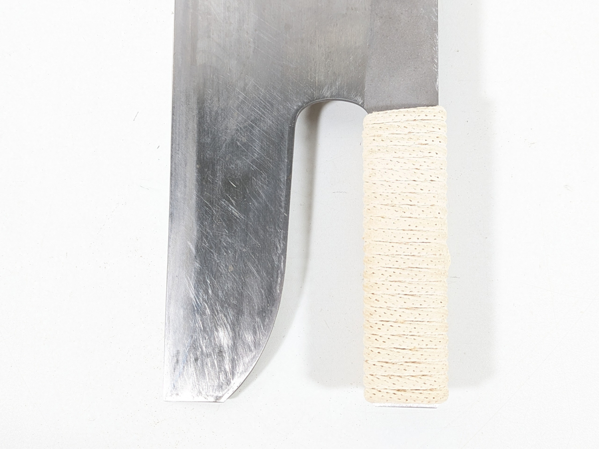 ・刃渡り:約30.5cm ・刃幅(上部):約12.5cm ・柄の長さ:約14cm ・全長:約30.5cm※素人採寸のため多少の誤差はご容赦ください。 【取引ナビの対応日時】 ■平日9:00-18:00となります。※土日祝日は休業 【発送方法】 発送は佐川急便よりお送りいたします。 原則ご入金後、発送まで3日~7日お時間を頂いております。落札商品の量によって発送までのお時間が前後してしまう可能性があります。商品をお急ぎの方はご注意ください。 ※発送元地域が異なる商品の同梱はできません。 また土日祝日はヤフオクの取引全般をお休みしておりますので発送/連絡はできません。いつ頃発送するのか等の催促はおやめください。 ※沖縄・離島の方は【中継料】が発生し送料が高額になります為、佐川着払いとなります。 ※中継料が発生した場合、追加で中継料分の不足送料を請求させて頂きます。必ずご自身のお住まいをご確認頂いてから入金をお願い致します。 【直接引き取り】 引き取り場所は埼玉県久喜市になります。 詳しいご案内場所は落札後、取引ナビにてご連絡いたします。 受付時間:平日9-18時 ■手順 ① 取引情報の入力 ② yahoo!かんたん決済で支払うをクリック ③ 配送方法を直接引き取り0円を選択し決済を行ってください。 ④ 取引メッセージに 直接引き取り希望と、希望日、希望時間帯をお知らせください。 後程、ご案内の通知をいたします。 【注意事項】 ■発送連絡と同時に評価も入れております。評価不要の方はご落札時にメッセージでお知らせください。 ■商品到着後、破損があった場合は配送業者へ一度ご連絡をお願い致します。 ■発送方法の変更はお受けできません、また送料に納得がいかないままの入札はご遠慮ください。 ■商品到着後7日以上経ってからの返品・返金は対応出来ません。品物が到着次第すぐに商品の状態をご確認ください。 ★他にも沢山の商品を出品しております。 ご興味のある方は、他の商品も是非ご覧下さい。 |