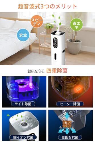 【タイマー設定・定湿機能付き・空焚き防止機能】 1-12時間以内に1時間ずつタイマーが設定でき、加湿器の停止を自由に制御し、消し忘れの心配がありません。また、湿度が5%ごとに40-90%の間に設定でき、センサーが部屋の湿度を感知して自動的に調節し、お好みの湿度を維持します。(設定湿度に達したら加湿器が運転停止し、設定湿度より低いのであれば加湿を再開します)水が足りないときに、給水不足表示ランプが青く点滅し、水量を感知の安全システムが働き、自動的に電源オフしますので、お年寄りや子供がいるご家庭でも安心してご使用いただけます。