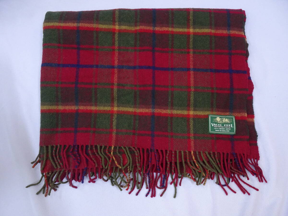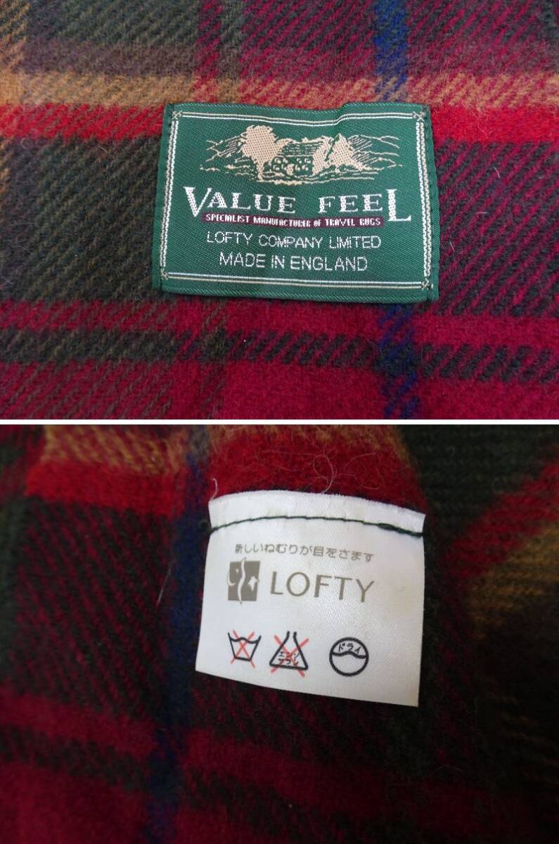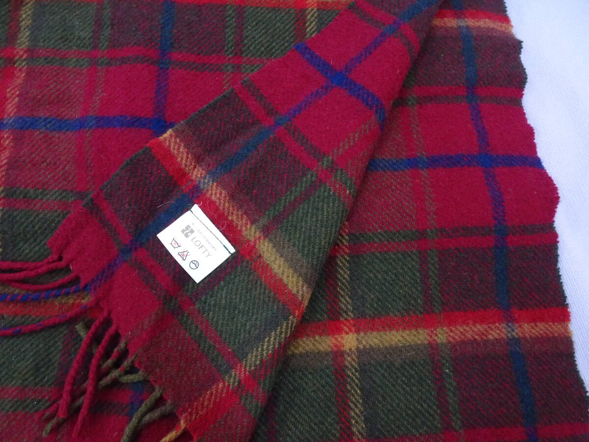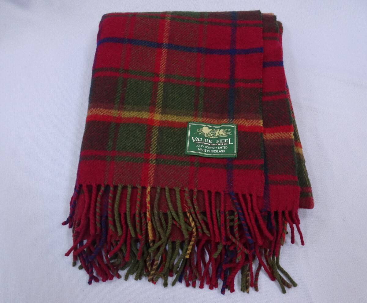 (M-1133) LOFTY VALUE FEEL ひざ掛け ブランケット ウール100% 大判 約144×123㎝ チェック柄 レッド 秋冬物 防寒 あったか アイテム 中古