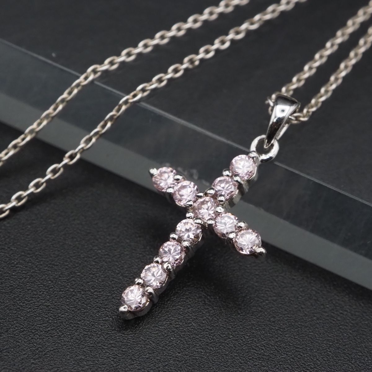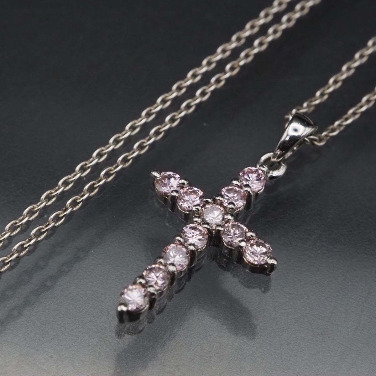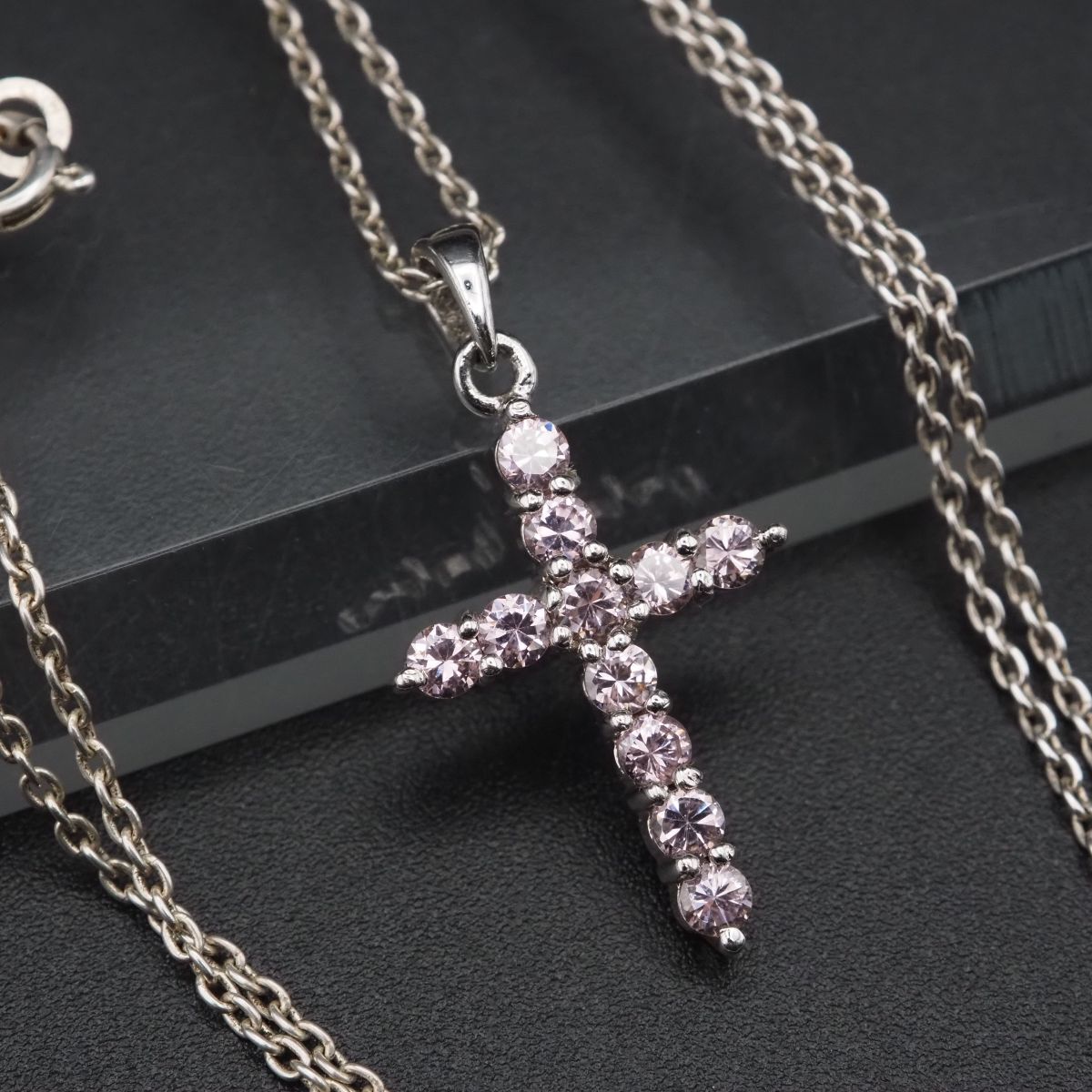 H843 ピンクストーン SILVER925刻印 ペンダント ネックレス クロス デザイン シルバー