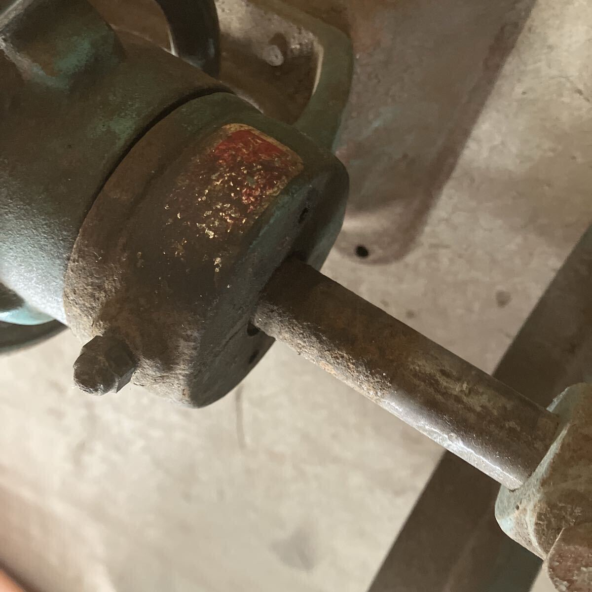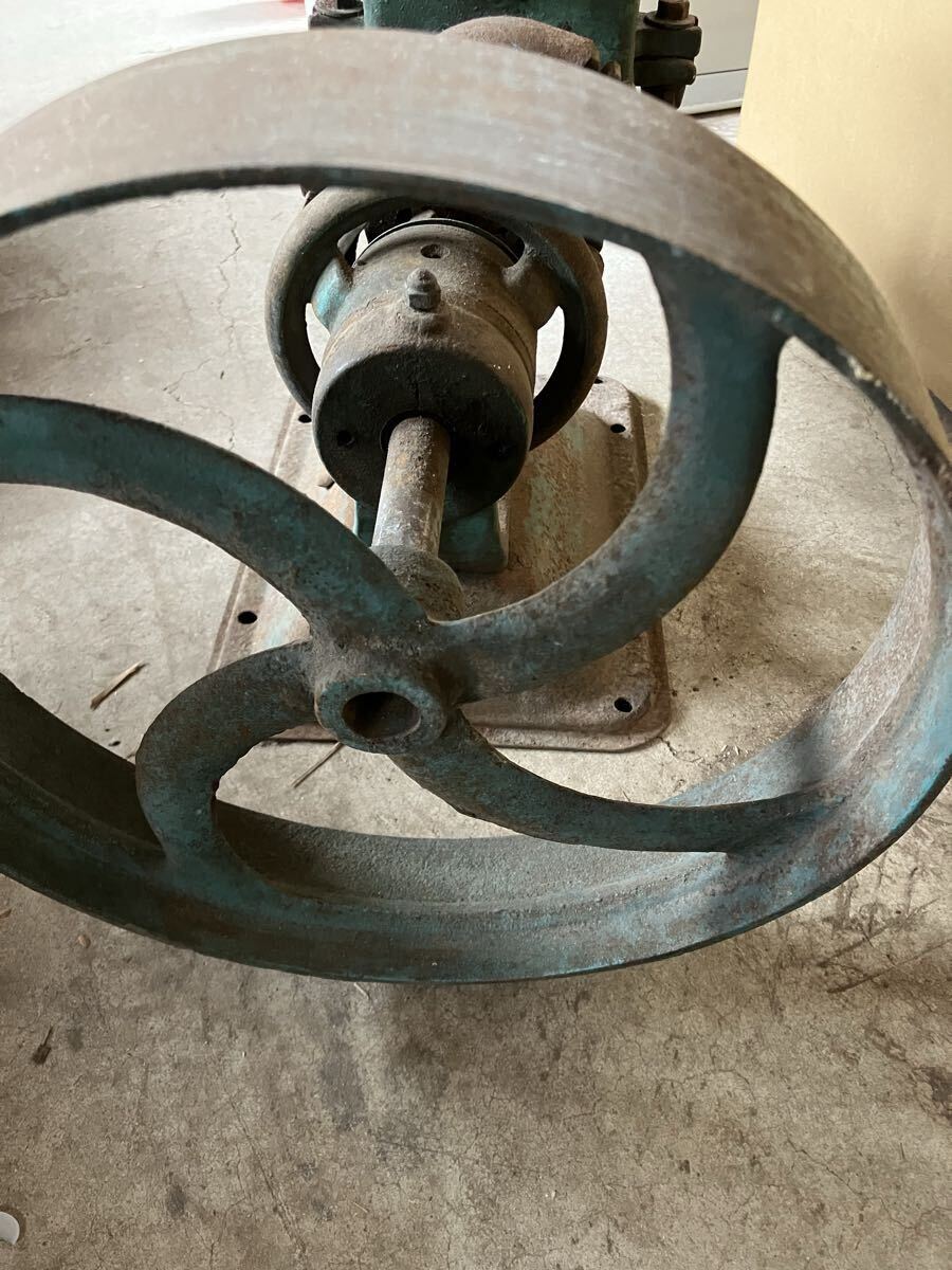 大きなフライホイールを回転させて内部で粉砕する仕組みの古い農具のようですが
