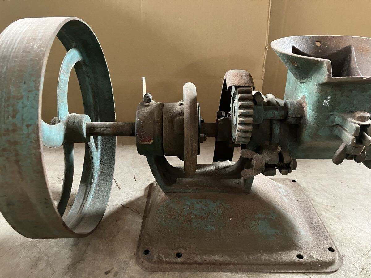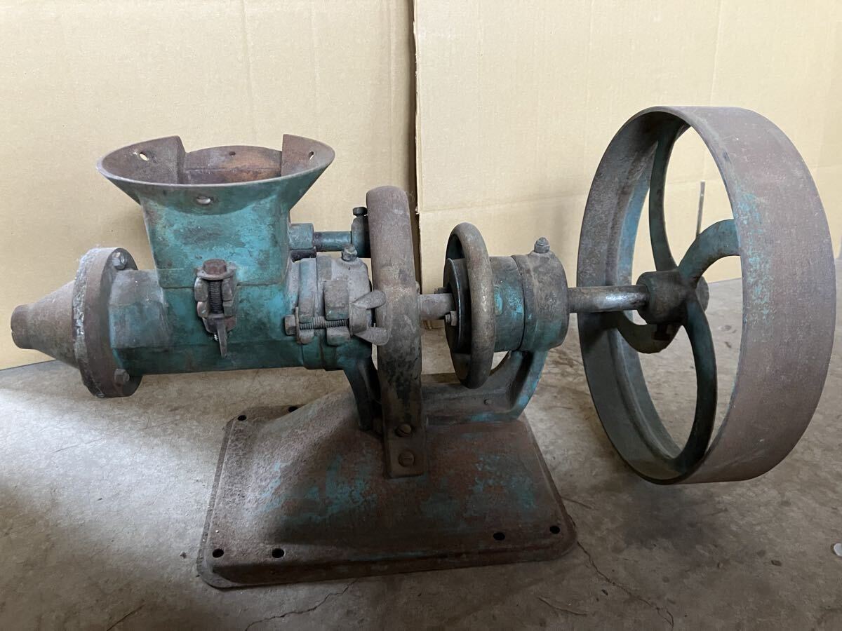 昭和期の手回し式粉砕機です。上部ホッパーに穀物を入れ、