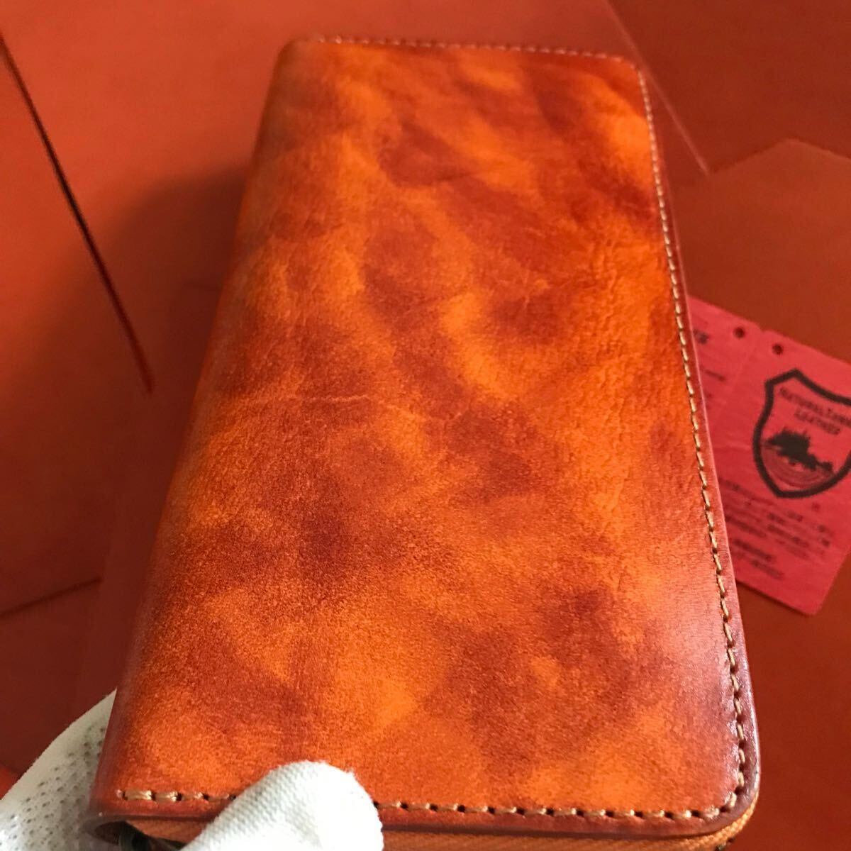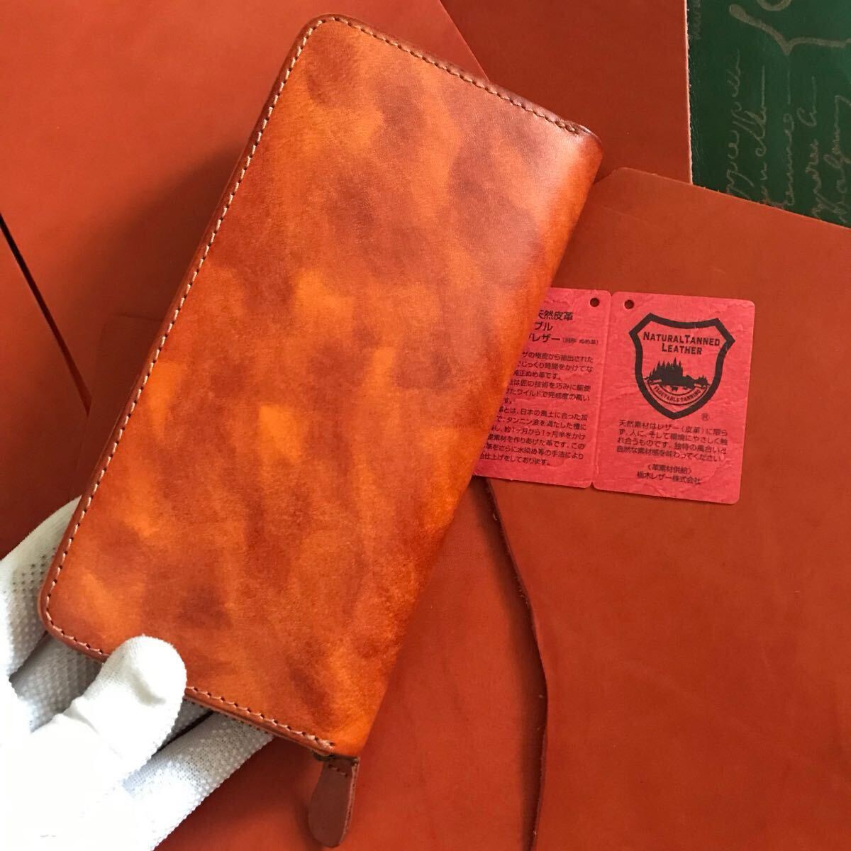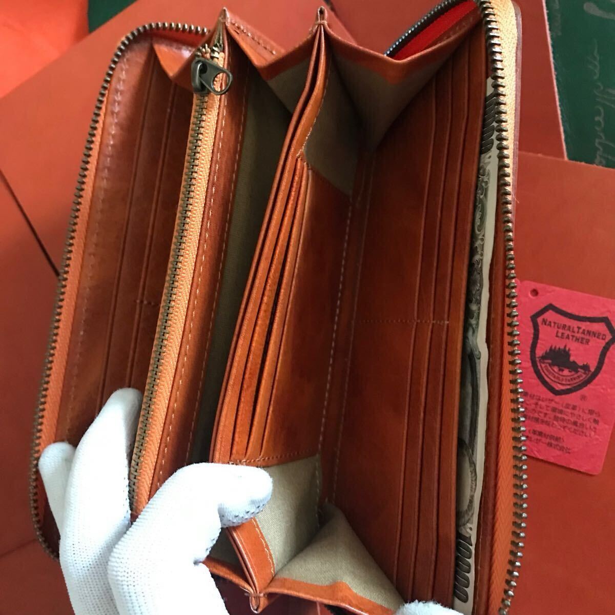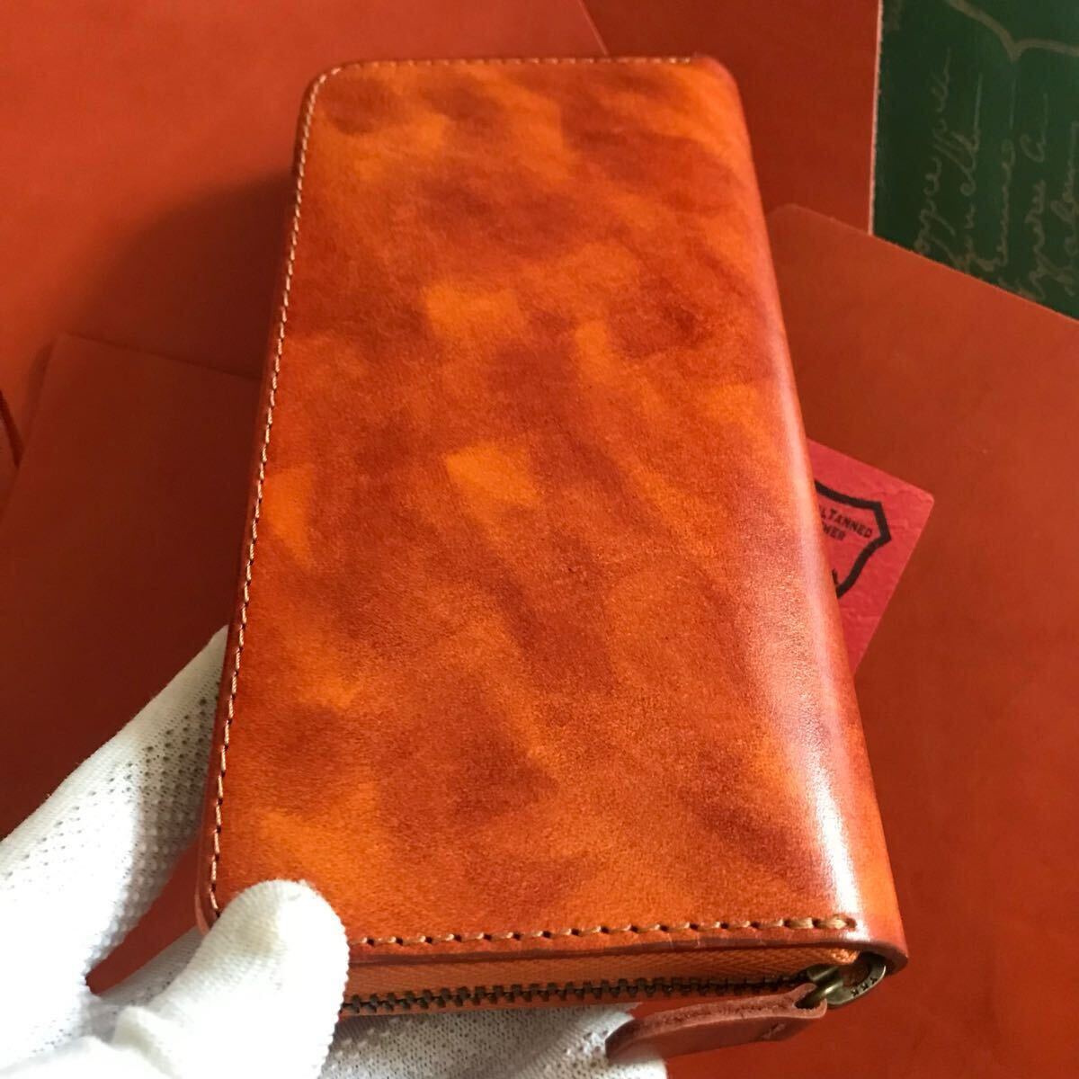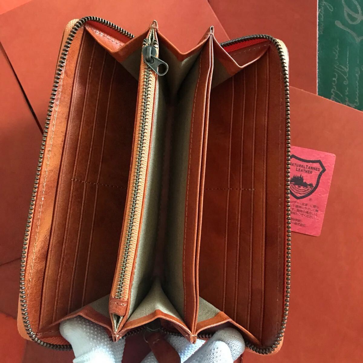 収納力抜群のラウンドファスナータイプ長財布、栃木レザーを使用しました、栃木レザーに手作業で何度も染料を塗り込んだ。