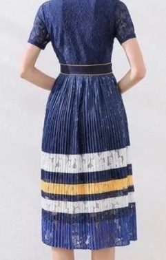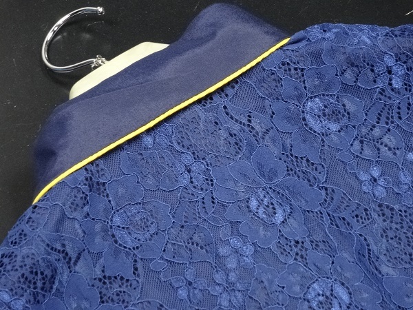 前ボタンプリーツスカートのワンピース。上半身はネイビーのレース地に前ボタン。ウエストとフロントに黄色のバイアスを入れてアクセントに。スカート部分はチュール地に幅1cmほどの細かいプリーツ加工をほどこし、歩くたびにプリーツのひだが美しく広がる魅力的なデザインになっています。ちょっとおしゃれな普段着として、またフォーマルなシーンにも活躍してくれる一着です。裏地付。右サイドファスナー有(前ボタン)。
