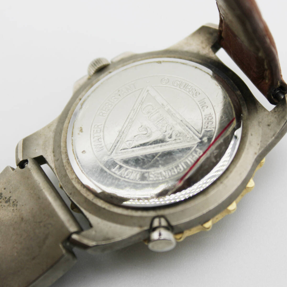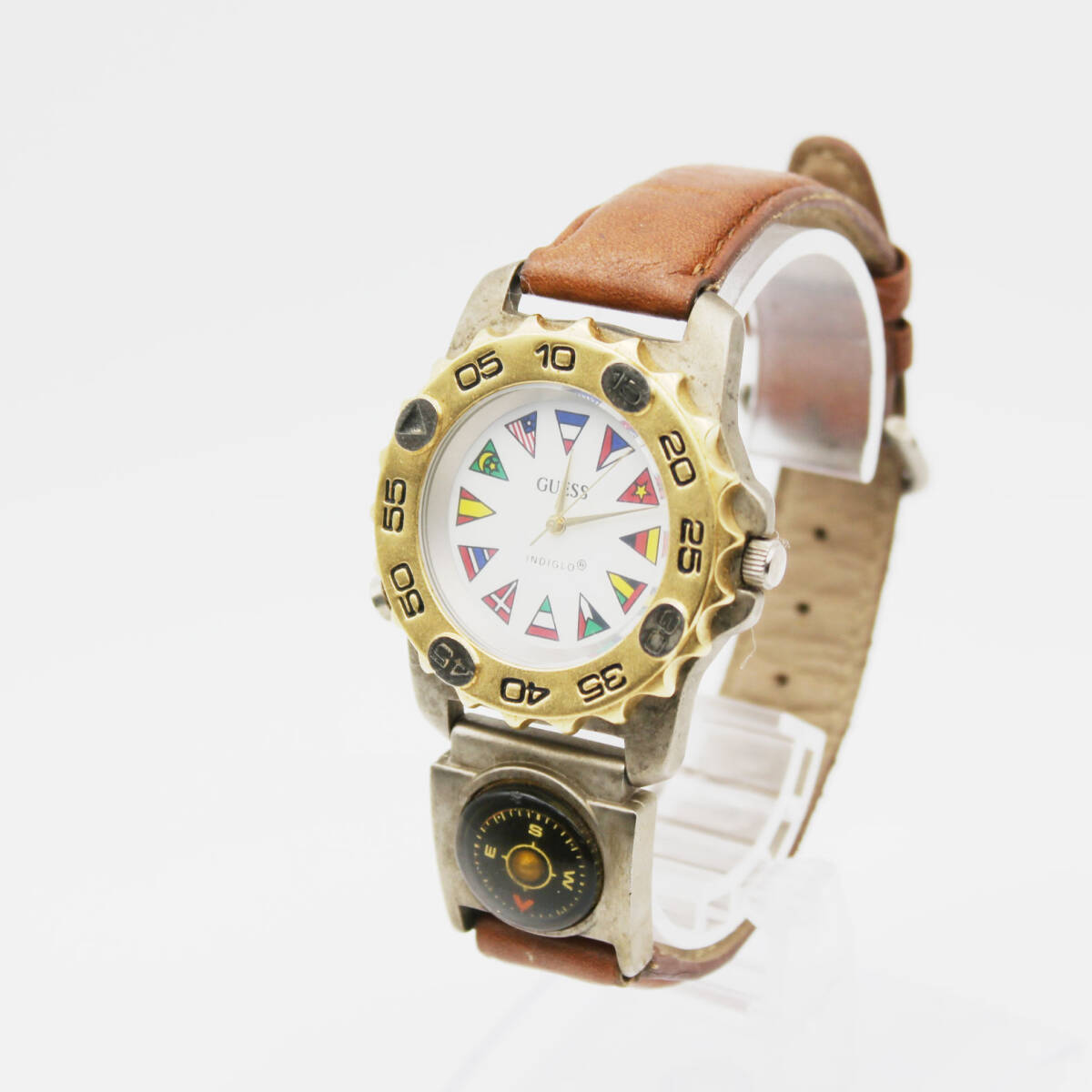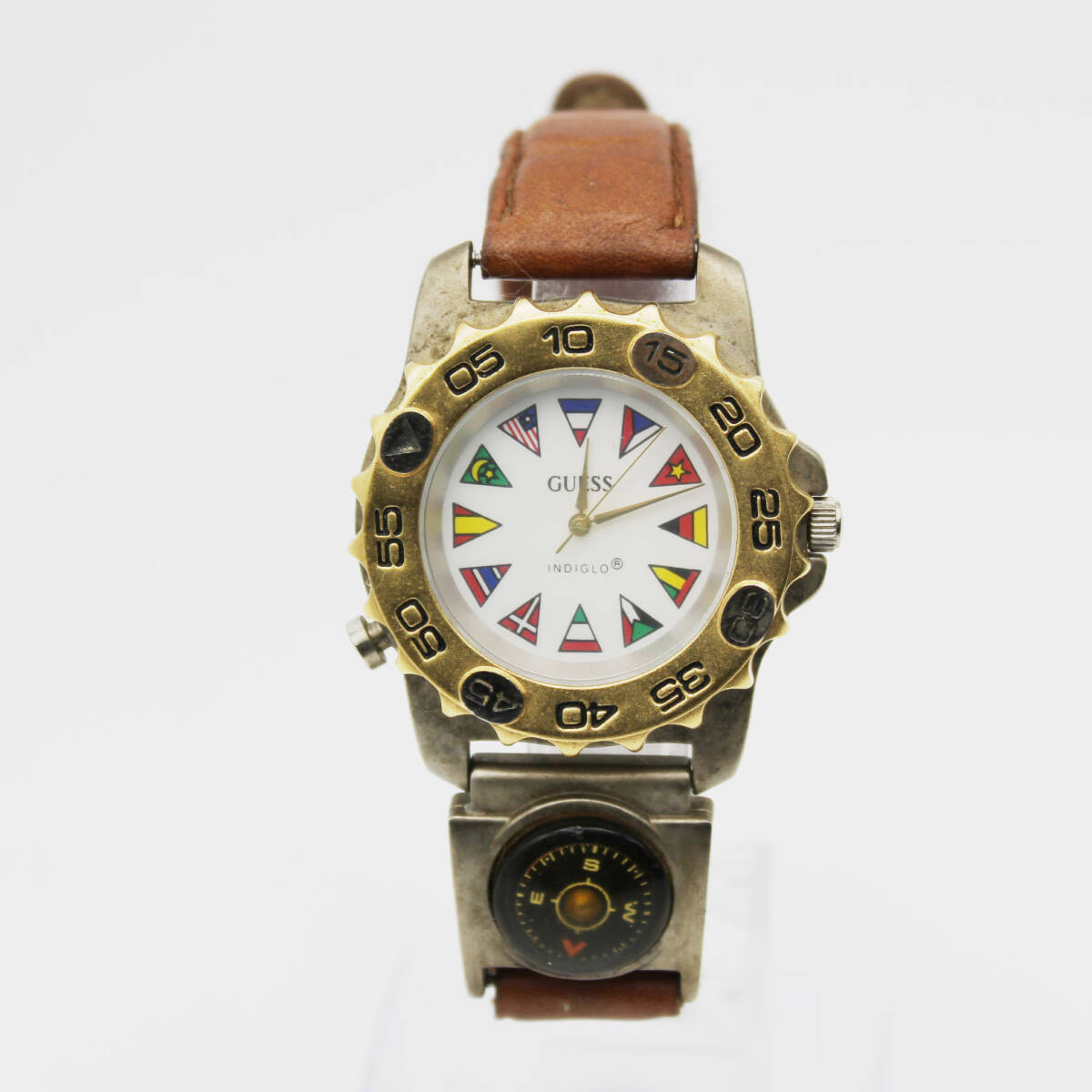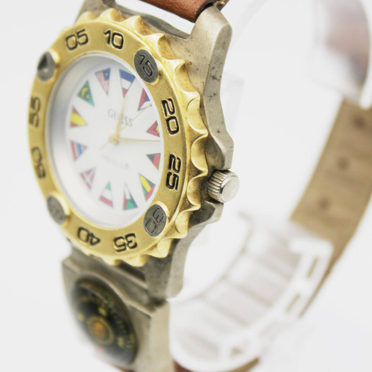 W251114-46 GUESS INDIGLO ゲス メンズ腕時計 クォーツ ジャンク 文字盤ホワイト 国旗 方位磁石付き ベルトレザー
