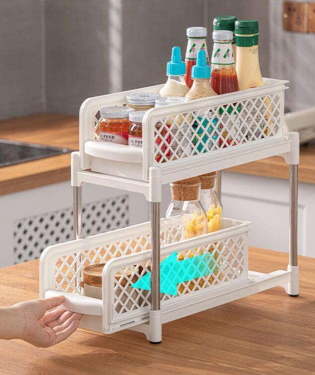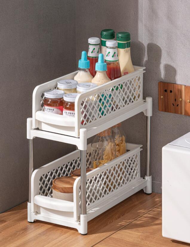 材質:PP ※耐荷重(約):上段:約3kg、下段約4kg ※サイズ(約):画像をご参照ください。 収納力抜群で、背の高い調味料のストック品を収納するのに便利な背高2段ワイドタイプです。 (1)スライドデザイン、滑りがよくスムーズでノイズなしです。 (2)取り外せる引き出し。使う状況によって引き出し棚を抜き出して単独使用できます。 二段式デザインを採用、低い高いものをきちんと並んで、空間を効率よく利用できます。かまど、シンク下、シンク上、袋戸棚、トイレや部屋で色んな場所で大活躍です。