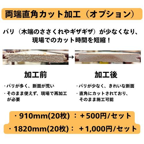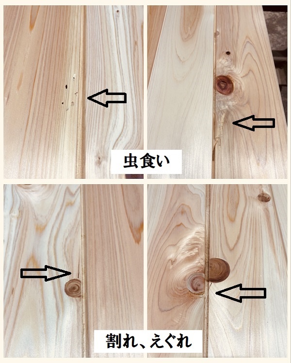 ・寸法誤差あり。端は直角でなく、端部に割れ・抜け節・へこみ等あります。