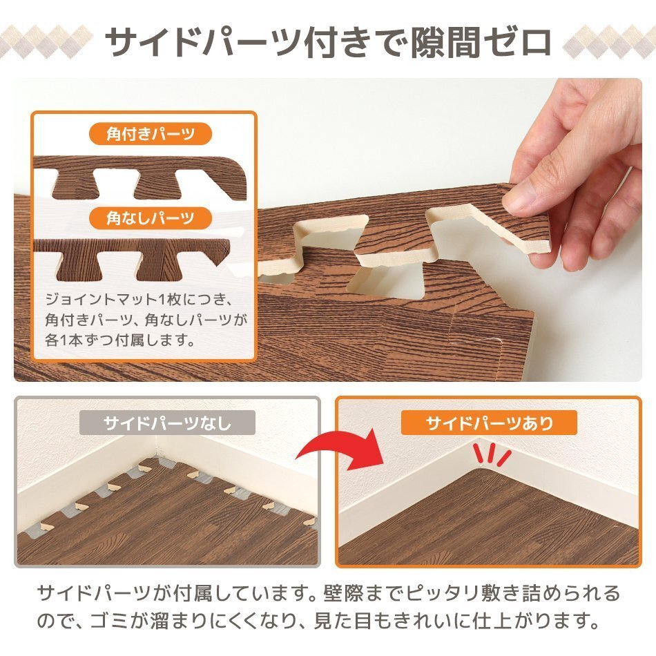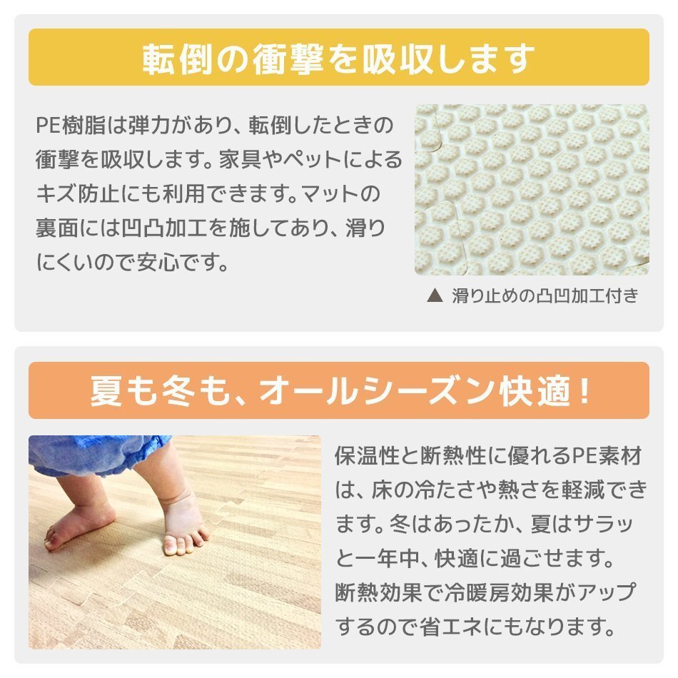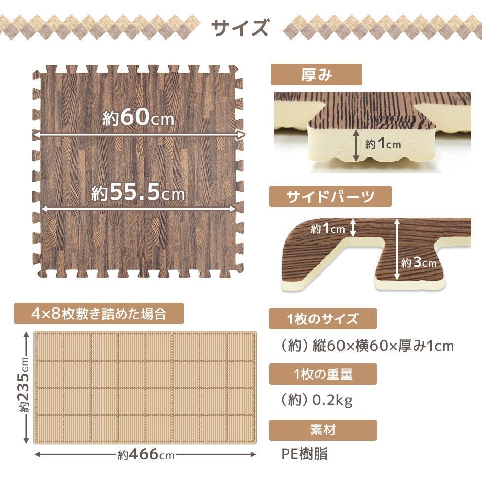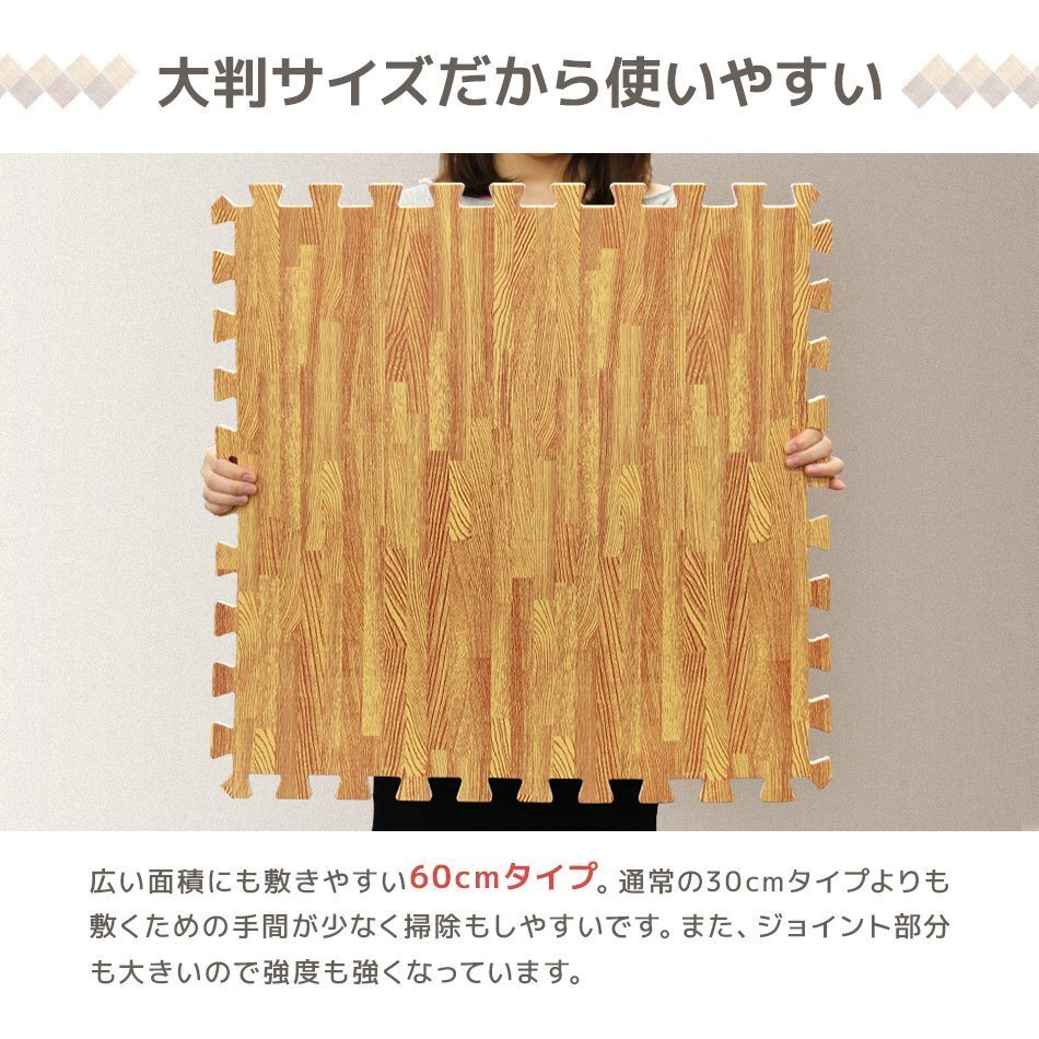 | 60cm 大判 ジョイントマットです。 カッターやはさみで簡単に切れるのでレイアウト自由自在! 足音をやわらげてくれるので、子供部屋やフローリングのお部屋に最適です! 適度なクッション性が転倒時に衝撃を和らげてくれます! 冬は床下からの冷気をカット! 夏は冷房による温度を効率よく保ちます。 汚れた部分は取り外して水洗いが出来てカンタンお手入れ♪ 嬉しい!サイドパーツ付き! 壁ぎわに敷いても、隙間なくキレイに。 掃除がラクラク!! 自然をイメージした木目デザイン! お部屋に落ち着いた雰囲気を与えてくれます! 【商品仕様】 カラー:ナチュラル サイズ(約):幅60×奥行60×厚み1.0cm(※1枚) (設置目安サイズ(約):121×121cm(正方形)) 素材:PE素材 【商品内容】 ジョイントマット 32枚 サイドパーツ(角付きパーツ32本、角なしパーツ32本) ※床材との温度差で製品が反る場合があります ※入荷時期によって厚みや幅に多少の誤差がある場合がございます ※商品はモニターによって色合いが異なって見える場合があります (マット 木目 木目柄 WEIMALL WEIWEIホールディングス) |