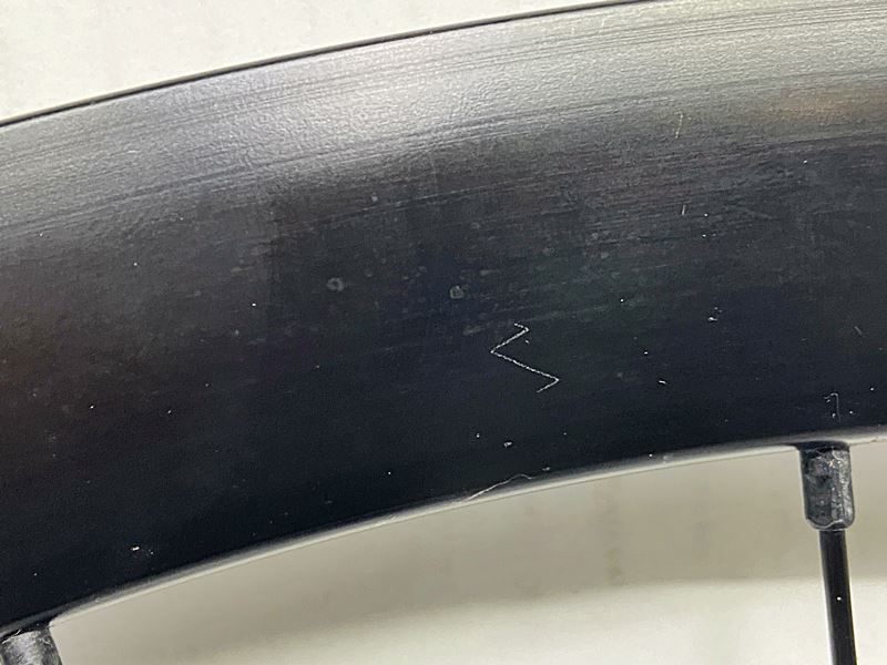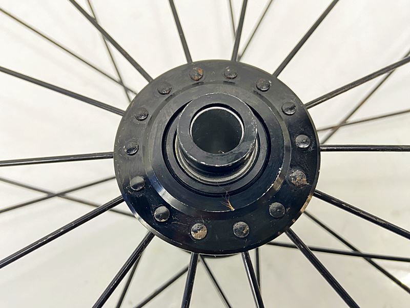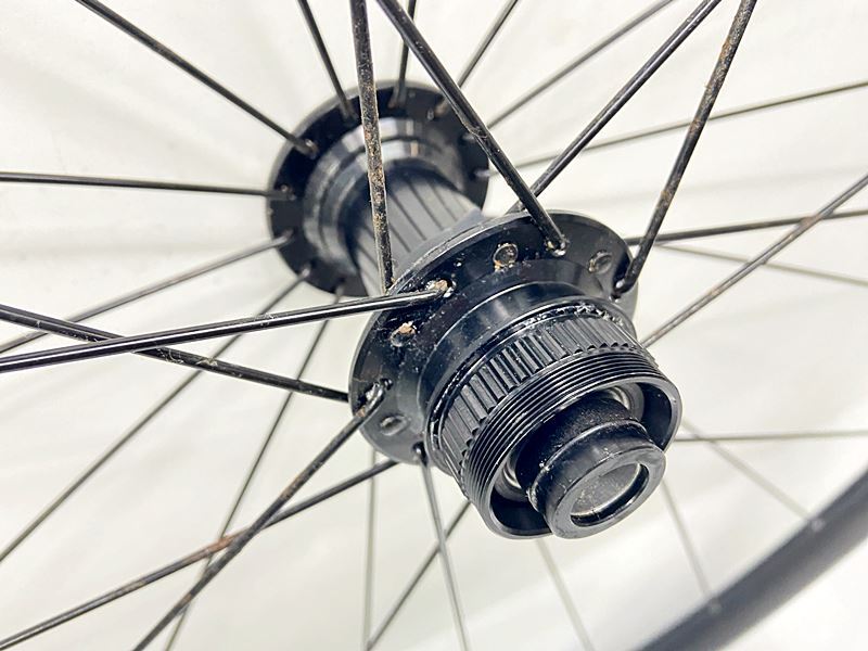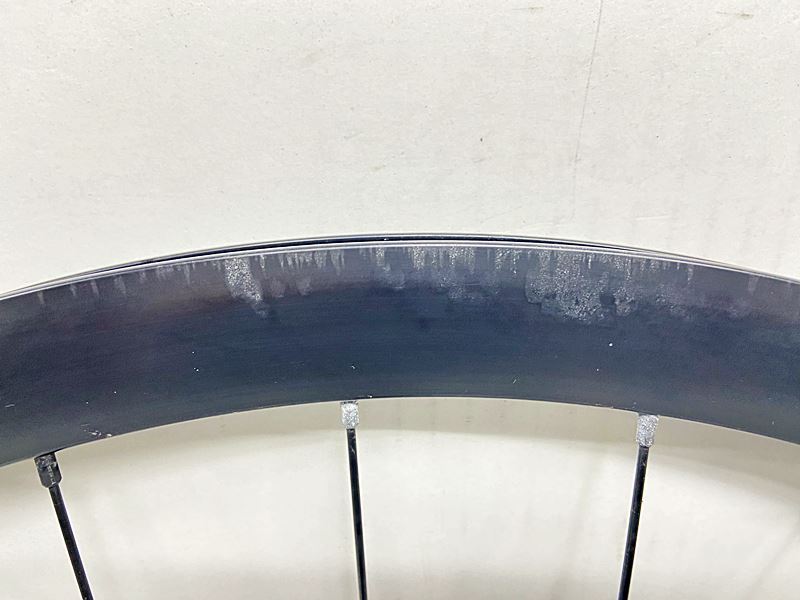 前後ともに、リム外周に削れキズ、スレがあり、スポーク、ニップルにはキズ、サビがみられます。