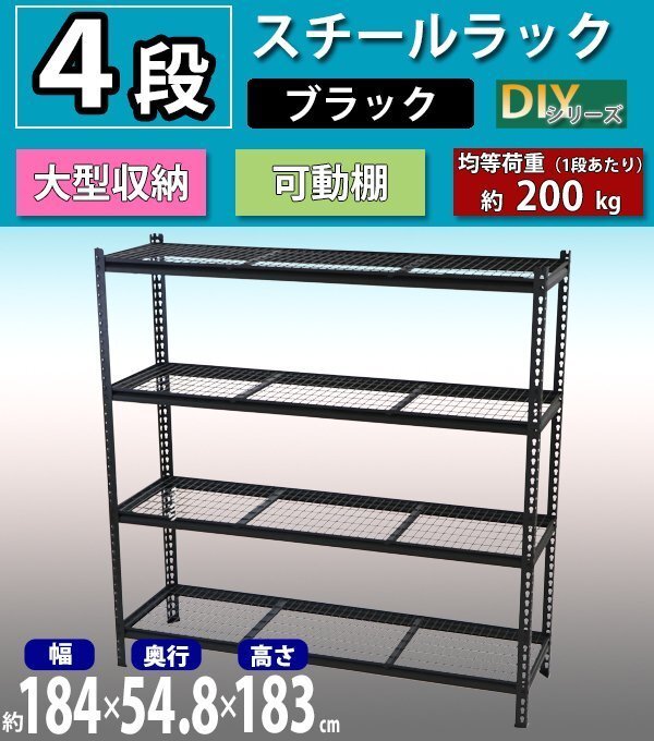 | 商品名 | 送料無料 4段 スチールラック 大型 ワイヤーシェルフ ブラック ボルトレス 粉体塗装 約幅184×奥行54.8×高さ183cm 高さ調節 スチール棚 スチールシェルフ オープンラック ワイヤー 業務用 収納ラック 収納棚 工具棚 ガレージ 収納 スチール 棚 ラック 黒 4stlrsr41bk |