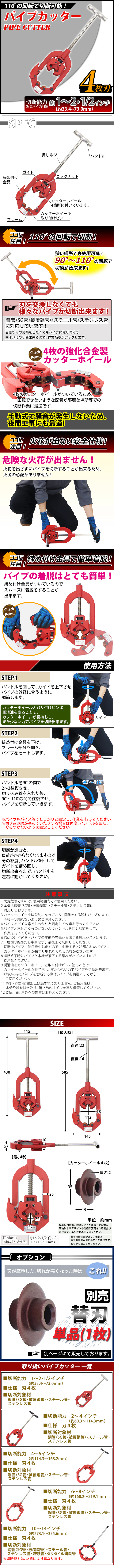 | 商品名 | 送料無料 パイプカッター 4枚刃 対応パイプ外径 約1~2・1/2インチ 1B~2・1/2B 約33.4~73.0mm 25A~65A パイプカッタ 単管カッター 切断機 手動 パイプ用 カッター パイプ 管 切断 単管 埋設管 鋼管 SG管 被覆鋼管 スチール管 ステンレス管 作業工具 配管 pipecutter2s |