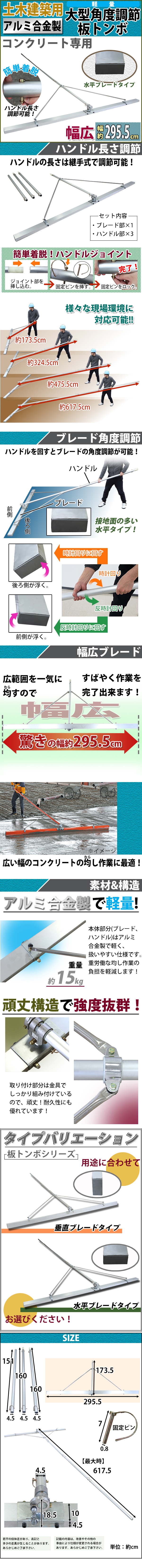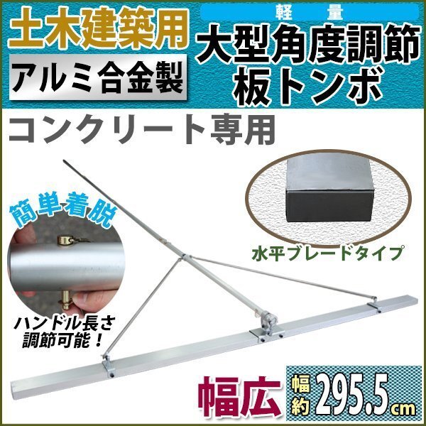 | 商品名 | トンボ とんぼ 大型角度調節板トンボ アルミ合金製 コンクリート専用 土間仕上げ 軽量 約15kg 幅約295.5cm 伸縮 長さ調節 水平ブレードタイプ アルミトンボ アルミ板トンボ アルミレーキ コテトンボ アルミ代かき レベラー 土間ならし レーキ アルミ製 tonbocr30 |