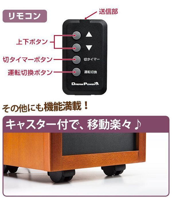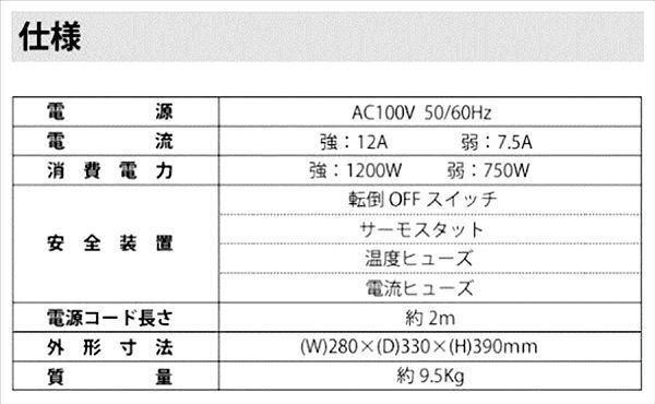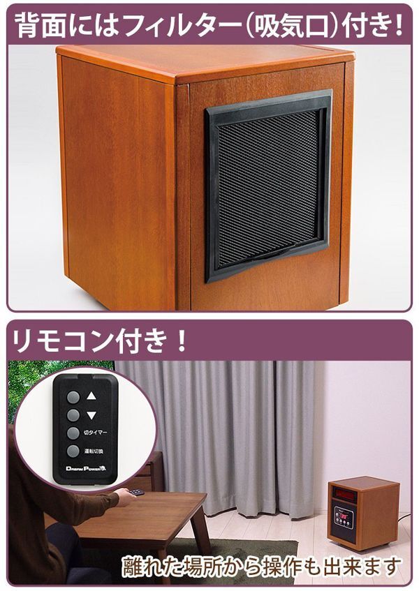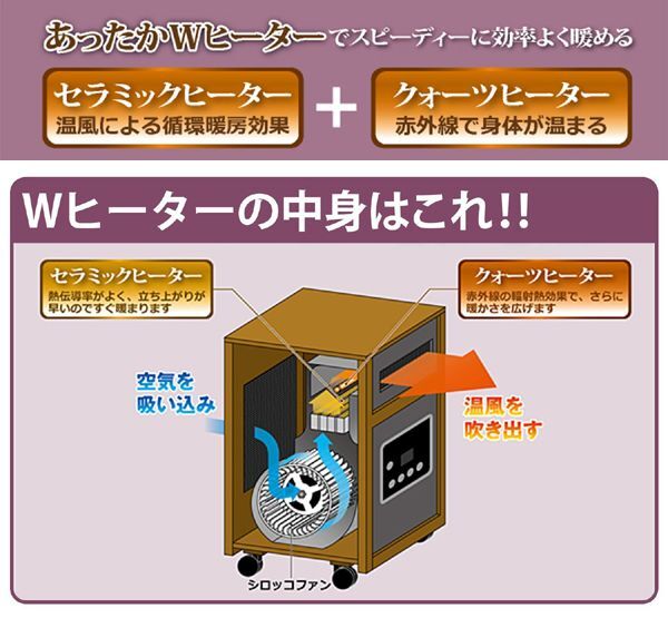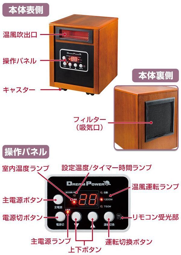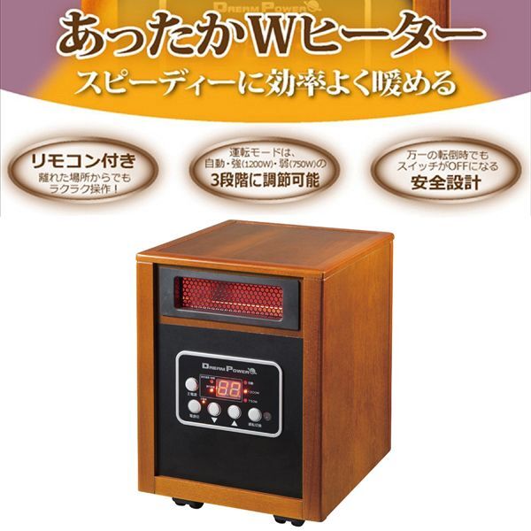 | 内 容 | ■ナカトミ あったかWヒーター ドリームヒーター (1200W/750W 2段階切替) リモコン付 タイマー付 ■品番 DH-1200 ◆参考価格 26800円相当 【商品仕様】 本体サイズ:幅28×奥行33×高さ39cm 電源:AC100V(50Hz/60Hz) 電流:強=12A、弱=7.5A 消費電力:強=1200W、弱=750W 切タイマー:1~12時間 安全装置:転倒オフスイッチ、サーモスタット、 温度ヒューズ、電流ヒューズ 電源コード長さ:約2m 本体重量(kg):9.5 ●セラミックヒーターとクォーツヒーターのダブルで、スピーディーに効率よく暖める ●インテリア性を重視した高級感あふれる木製仕上げで和室にも洋室にもマッチ ●音が静かでお部屋の空気も汚さない ●運転モード:3段階切替可能(自動/強/弱) ●リモコン付きで離れた場所からでもラクラク操作 ※画像ご参考ください |