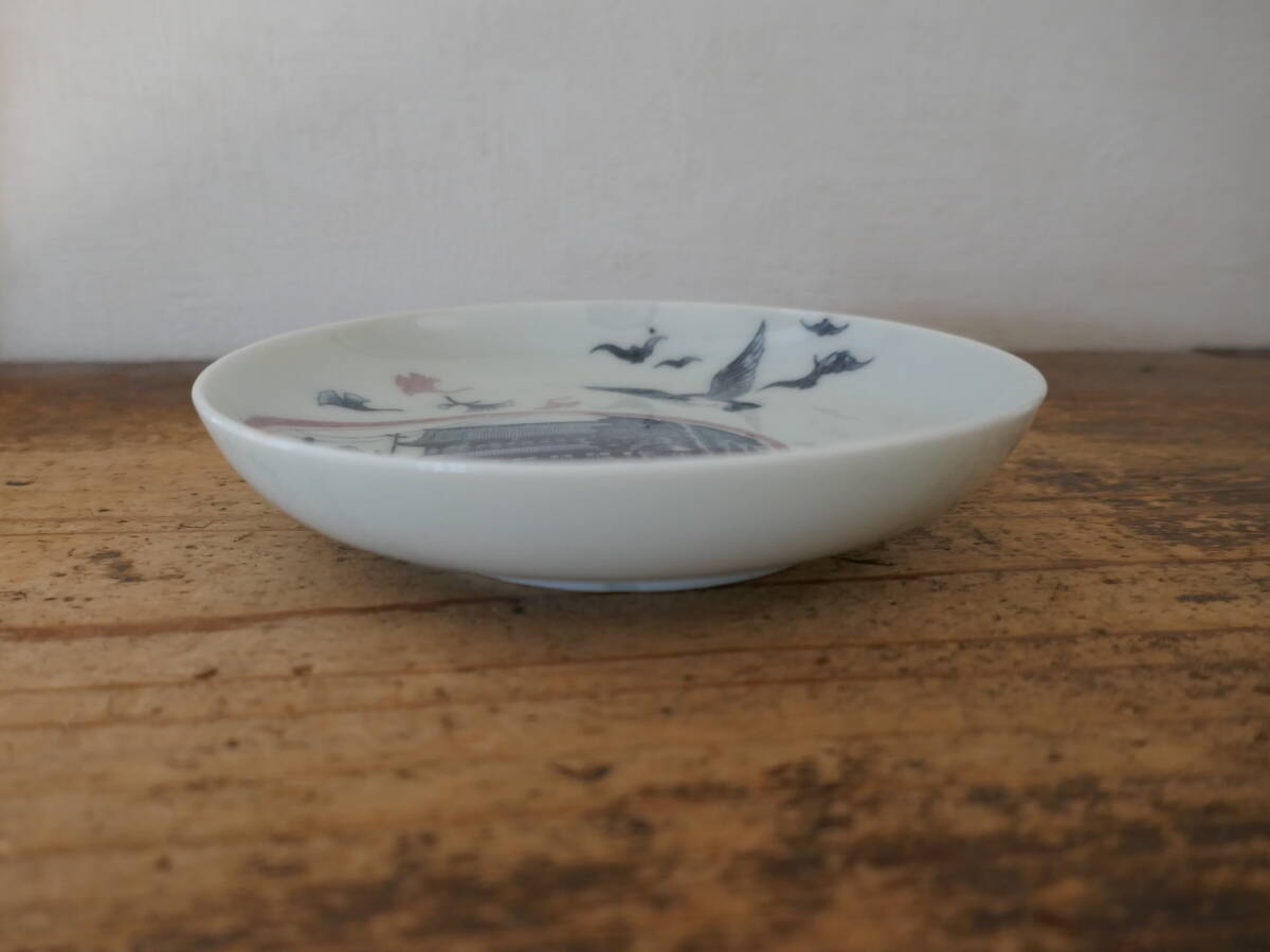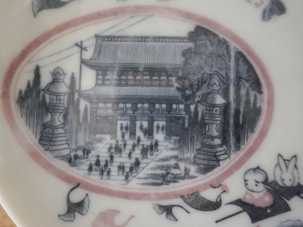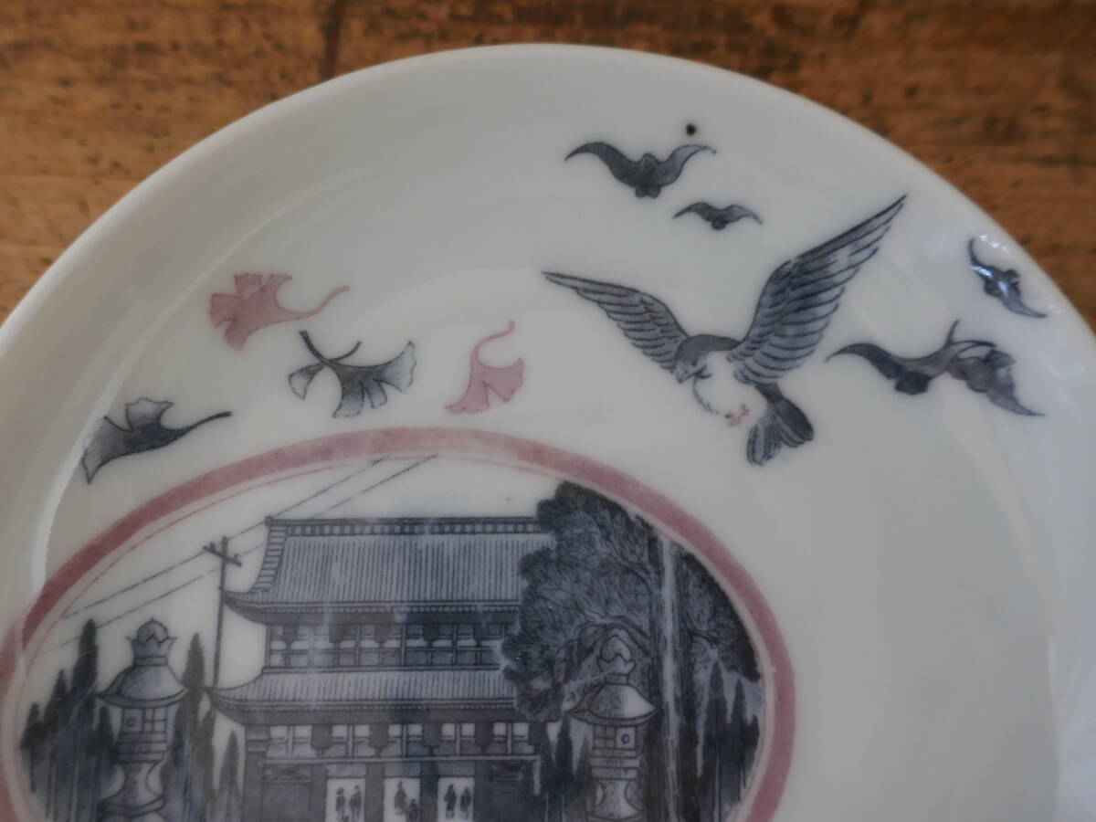 ◎図変わり印判 「浅草寺電線・鳩に兎図皿」美品 明治~大正 レトロ 信州旧家蔵出し