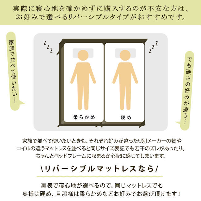 両面仕様のマットレス。裏表で寝心地の印象も変わります