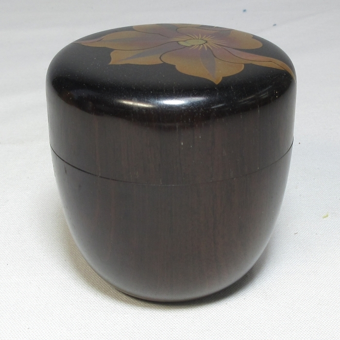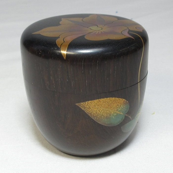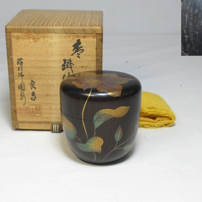【P0037】茶道具 名工【 土肥 良吉 蒔絵師 国泉 】合作 紫檀 黒檀 木地『 棗 』 美しい鉄仙蒔絵 共箱 共布 即決