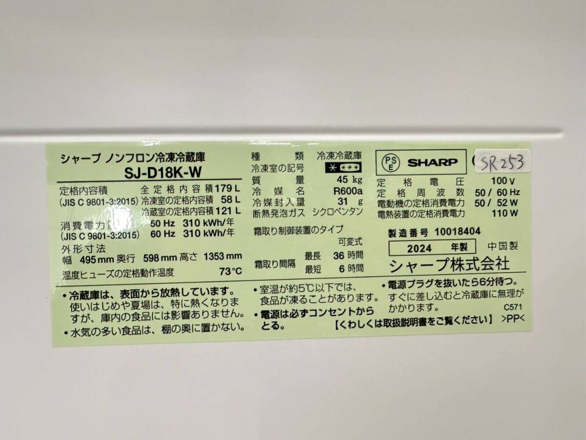 【高年式】大阪送料無料★3か月保障付き★冷蔵庫★シャープ★2ドア★2024年★SJ-D18K-W★SR-253