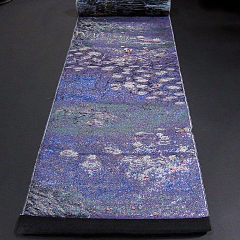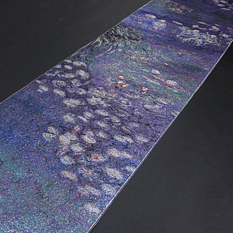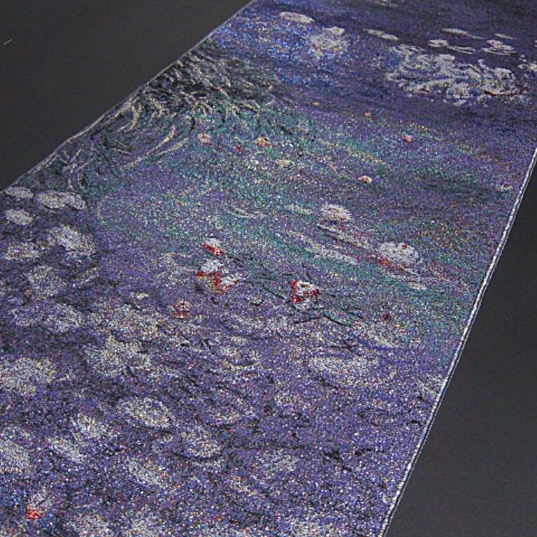 新品未仕立 西陣織丸巻袋帯です。こちらですが、名画、モネの睡蓮をモチーフに織り上げられた帯になります。エレガントに織りあがった逸品かと思います。クリエイティブなセンスあふれるひと品かと思います。パーティーなどにもいかがでしょうか。美しいグラデーションに織り上がっております。上品な大人のお洒落帯にぴったりの一品かと思います。