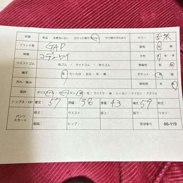 - ブランド:GAP(ギャップ) - アイテム:コーデュロイジャケット - サイズ表記:6(M相当) - カラー:赤茶(レンガ色系) - 素材:綿・ポリエステル ポリウレタン - 裏地:あり(花柄デザイン) - 特徴: GAPのクラシカルな雰囲気漂うコーデュロイジャケット。 温かみのある生地感と、女性らしいシルエットが魅力の一着です。 カジュアルにもキレイめにも合わせやすく、秋冬の羽織りにぴったり。 裏地の花柄がさりげなく可愛いアクセントになっています。 管理番号:06-119 即購入大歓迎・お得な割引各種あります 詳しくはプロフィールをご覧ください! 匿名&送料無料 海外輸入のため全て一点ものです 古着のため使用感・毛玉等があることもあります。写真で状態の確認を行なってからご購入ください おまとめ買いでお得な割引あります♪ 平置き採寸表→写真から確認いただけます! (素人採寸のため、多少の誤差はご了承ください) 商品状態に関しては、写真、商品説明欄に記載しております。着用回数、購入時期などはお答えできませんので、ご了承ください。着画、写真の追加もお断りしております。 簡易包装のコンパクト発送となります。 畳みシワはご了承の程、宜しくお願いいたします。 商品によっては圧縮してお送りするものもございます。 撮影環境や使用するモニター、反映されにくい色味など、 商品と画像に若干の色誤差が生じますことをご了承ください。 出品作業の際にしっかりと確認はしておりますが、シミなどの見落としがある場合もございますのでご了承下さい。 古着の取り扱いになりますので特有の匂い等がある可能性があります。ご理解のある方のみご購入の程お願い致します