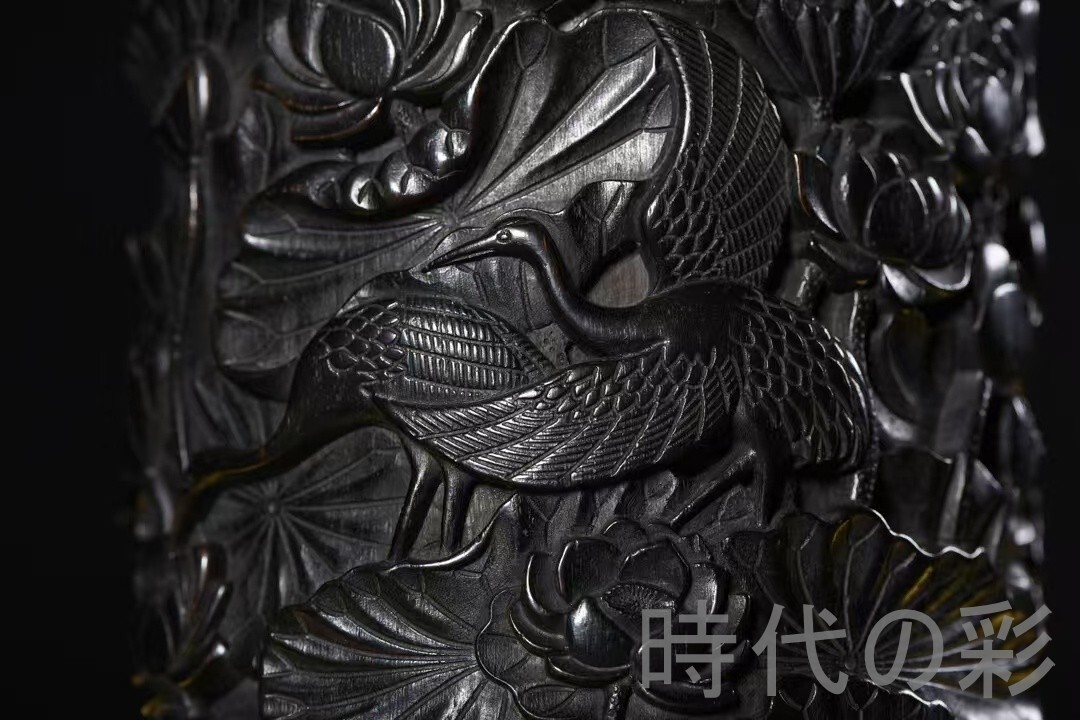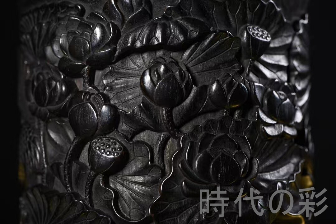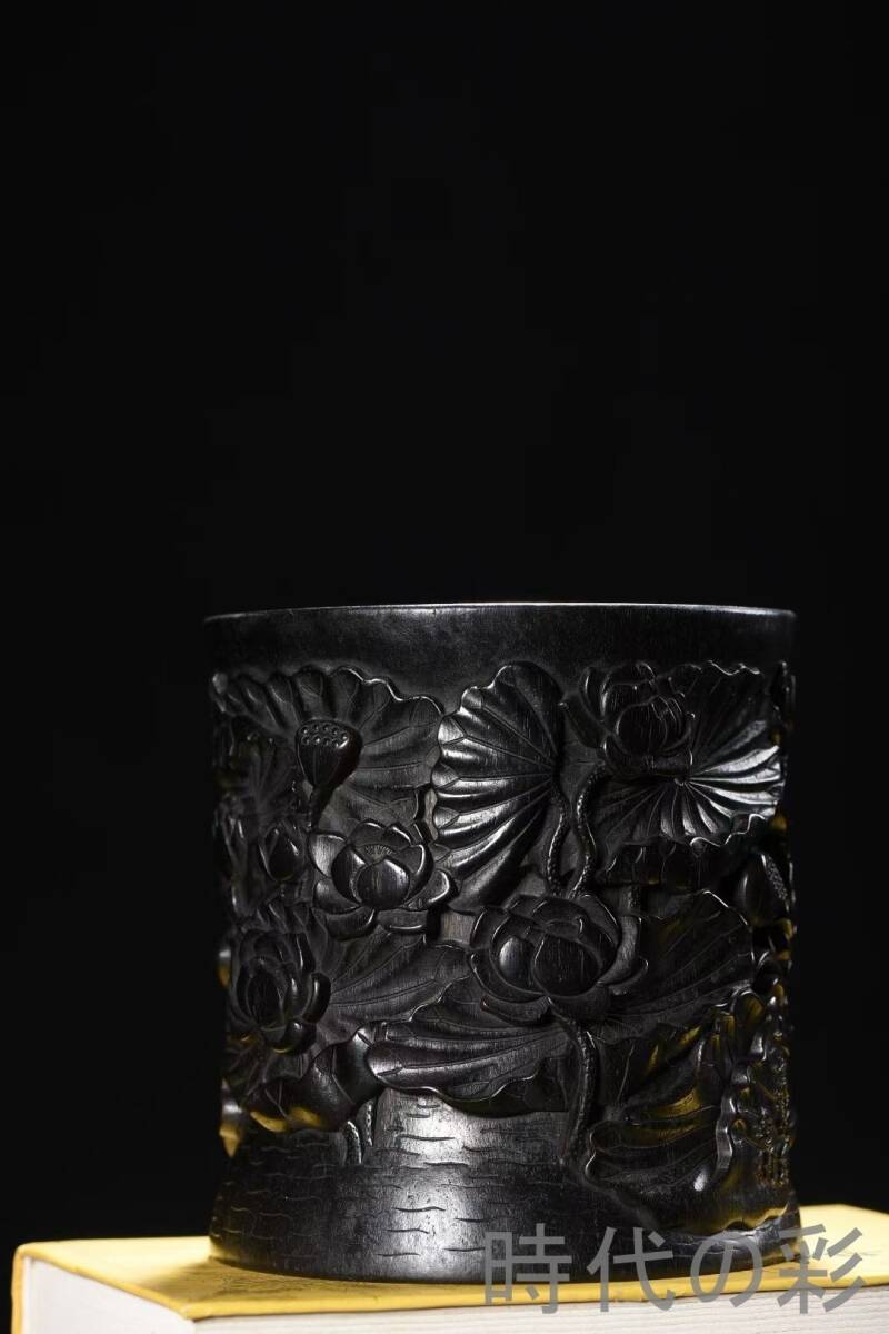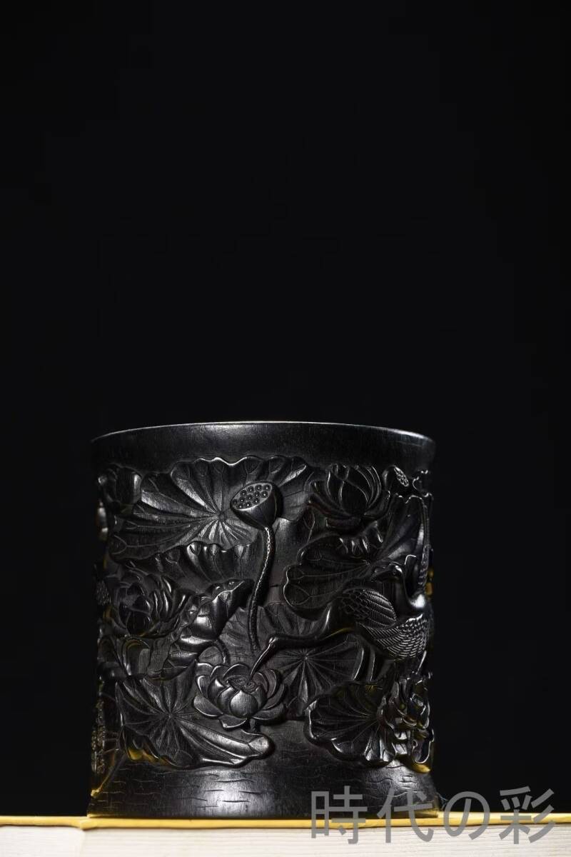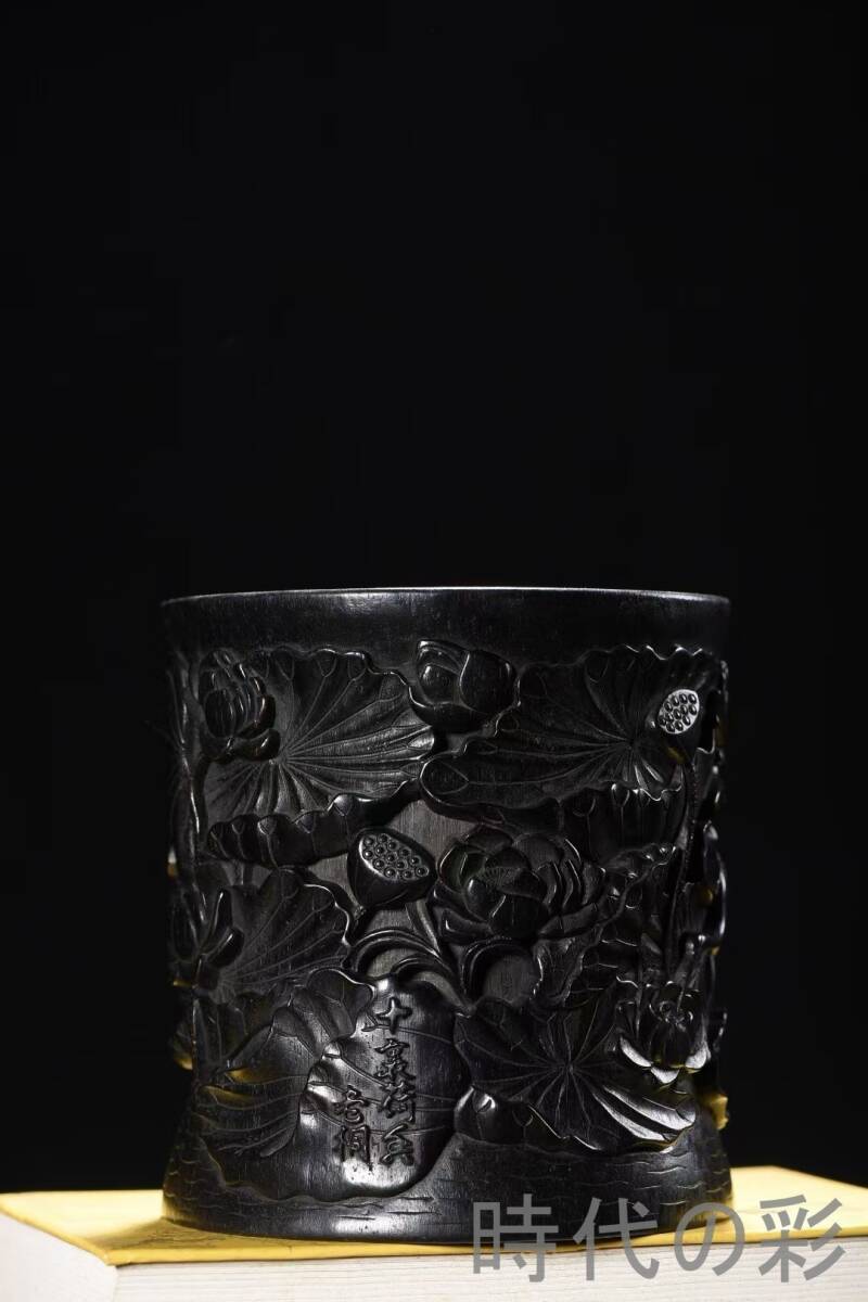 【美の継承】中国古美術 木彫筆筒 十里荷花図 彫刻 木製 文房具 唐物 美術工芸 收藏品 骨董品 古置物 擺件 古賞物 古美味 R07110615