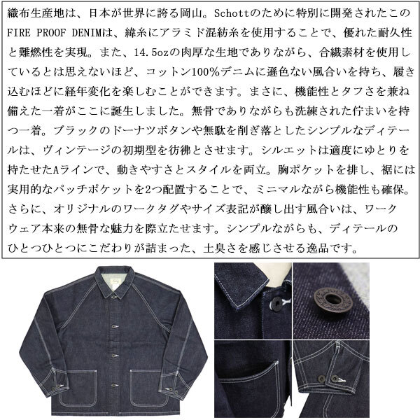 | 商品名 | Schott (ショット) 5952005 LOT. 962J FP COVERALL ファイアプルーフ デニム カバーオール 367INDIGO 36 |