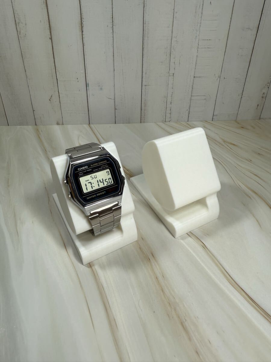 シンプルでスタイリッシュなデザインの腕時計用スタンドです。耐久性のあるプラスチック素材を使用しており、軽量で扱いやすく、デスクや棚の上で腕時計を美しくディスプレイできます。