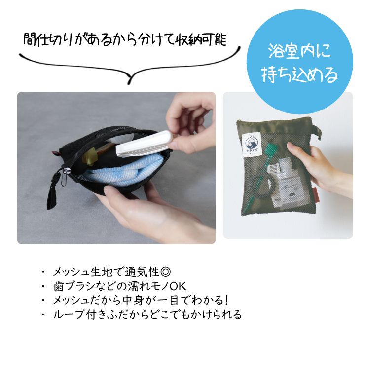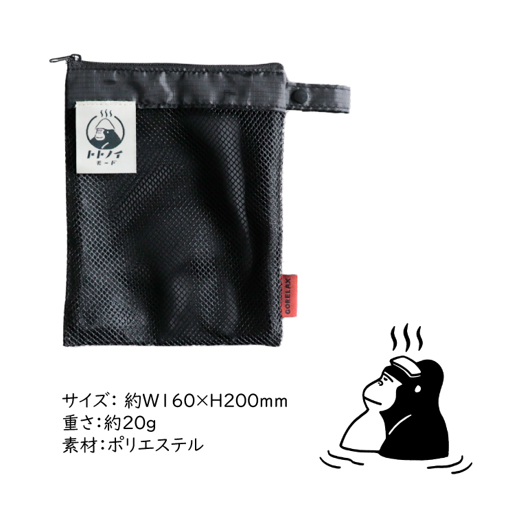 ごリラックスからサウナに行く日も行かない日もデイリーにも使える新シリーズ「トトノイモード」が新登場!シンプルなのになぜか使いやすくて手に馴染む。湯めぐりポーチはメッシュ生地で通気性抜群です。濡れモノOKで浴室内にそのまま持ち込めます。中身が見えるから取り出しやすく、Wポケットで歯ブラシや小物もすっきり収納できます。ループ付きだからどこでも引っかけられる便利アイテムです。ごリラックスは、サウナをテーマに、無口でシャイなゴリラのまもるさんがいつもがんばっているあなたの心と身体を整えてくれる、ととのい系ブランドです。忙しい日々の中に、ごリラックスを