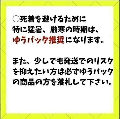 ネコポスは死着へのご対応は難しく代わりに2割多めの重量にて梱包しております。少しでも死着や運搬中のトラブルが気になる場合は必ず上記記載の通りゆうパックの商品を落札して下さい。