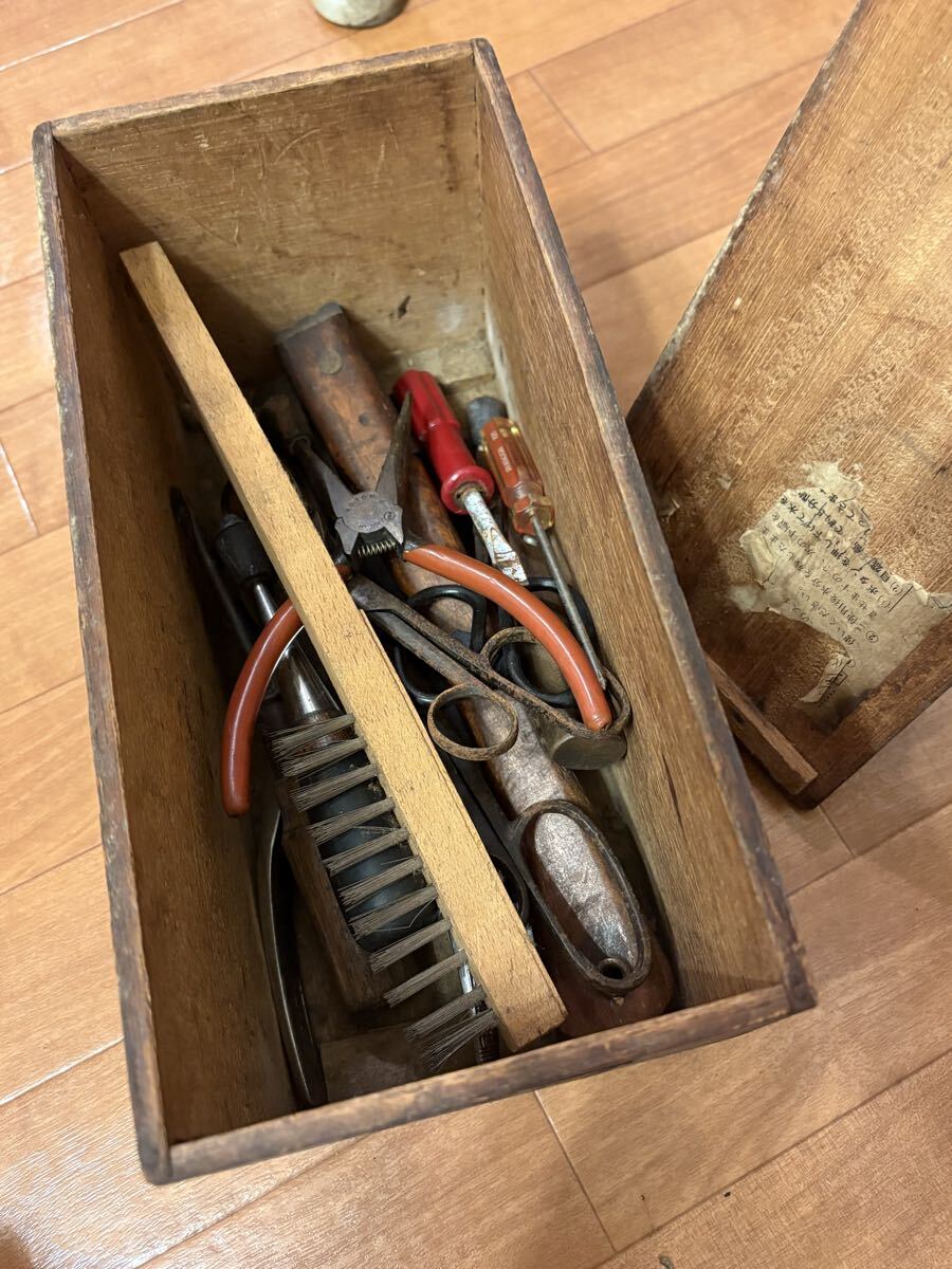 かなり古い物です、工具入れに使用していました 中の工具も込みです。中身不要の方はお知らせください お値段は変わりません!