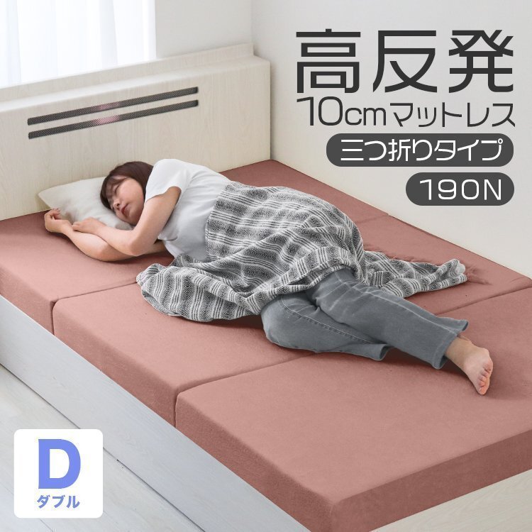 | 厚みたっぷり10cm! 適度な硬さで身体をしっかり支える、三つ折りタイプの高反発マットレスです。 柔らかいマットレスとは違い、身体の沈み込みを軽減した腰に優しい寝心地です。 高反発マットレスのウレタンフォームは弾性が高く、 適度な硬さで身体を支えるので、底つき感もなくへたりにくいマットレスです。 寝返りが多い方や仰向けに寝ることが多い方におススメです。 簡単にたためる三つ折りタイプなので、お部屋で立て置きして日当たりのいい場所で部屋干しが可能! 取り外しやすいL字ファスナー付き洗えるカバーが付属しています! ■商品コード:FEB004LL ■商品仕様 カラー:アッシュピンク サイズ(約):195cm×140cm×10cm(ダブルサイズ) 折りたたみ時:(約)65cm×140cm×30cm 重量(約):8.3kg 素材:高反発ウレタン 、パイル生地 他 硬さ:190ニュートン ■注意事項 ・圧縮梱包されたままの状態で長期間保管した場合、マットレスが復元できなくなってしまいます。 商品到着後、1週間以内に必ず圧縮から開放をして頂くようにお願いいたします。 ・マットレスは約1-2日で復元します。気温や温度により3-14日かかる場合もあります。 ・製品の臭いが気になりましたら、風通しの良いところで脱臭してください。 この臭いは素材のウレタンによるもので無害です。臭いに敏感な方は十分ご検討の上、ご購入をお願いいたします。 ・マットの硬さは温度によって変わってきます。また、硬さの感じ方には個人差があります。 ・カバーは取り外して洗濯ができますが、マットレス本体は洗濯しないでください。 ・生産ロットによって復元率・ニュートンに差異が生じる場合があります。 ・商品は、モニターによって色合いが異なって見える場合があります。 ・仕様・デザインは改良のため予告なく変更することがあります。 ■保障期間 7日間 ※商品到着後7日以内の初期不良・破損のみご対応させていただきます。 【新品未使用品です】 |