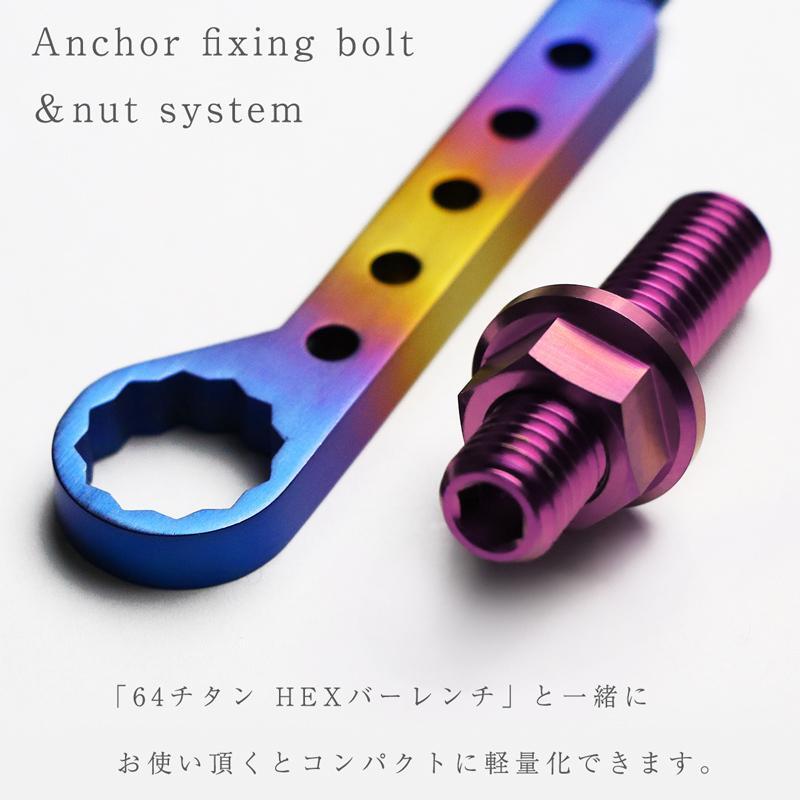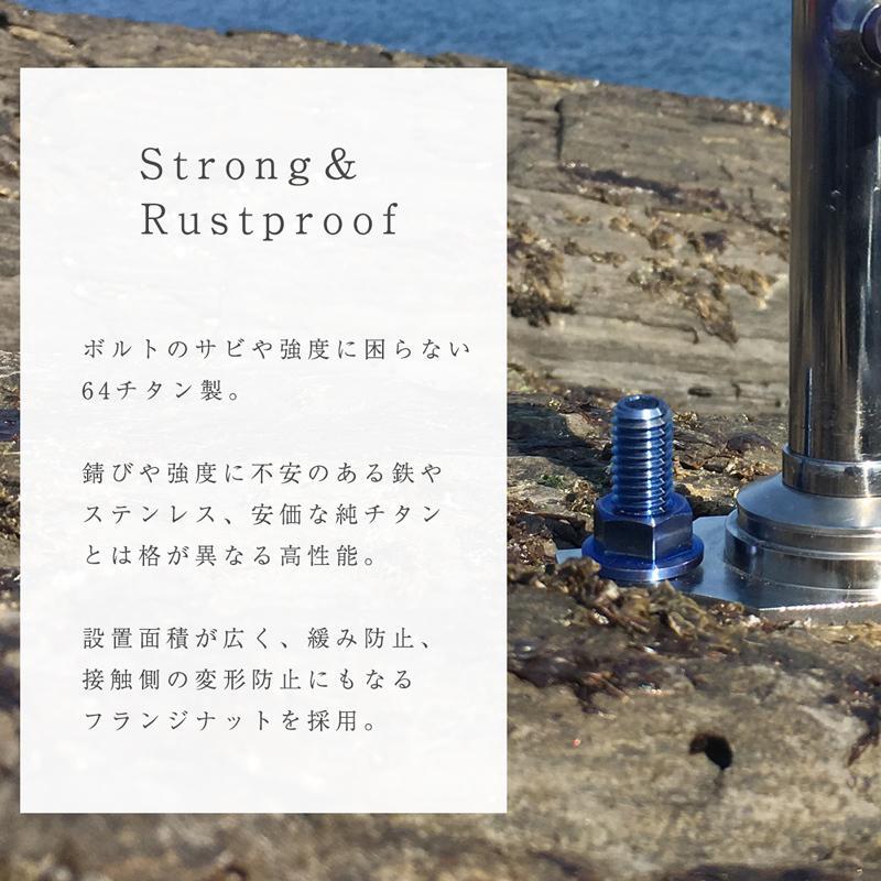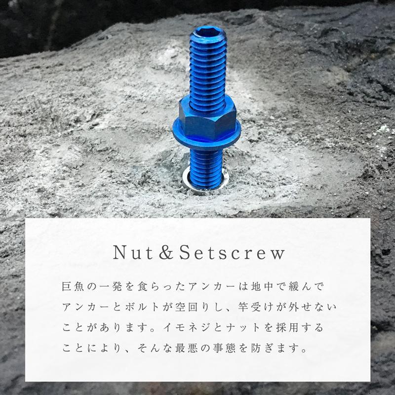 高強度かつ超軽量。一本であらゆる状況に対応。 クエ・石鯛専用 64チタン製 アンカー固定ボルト&ナットシステム 45mm・60mm(M10、W3/8) ・ボルトのサビや強度に困ることはありません。 ・アンカーが空回りしても、竿受けを外せます。 ■クエ・石鯛釣りに特化した、アンカー固定専用ボルト&ナットシステム 竿受けや竿尻受けなどをアンカーに固定することに特化したボルト&ナットシステムです。イモネジとナットを採用することにより、荒磯でのあらゆる状況に対応することができる画期的なアイテムが完成しました。専用工具「64チタン製 Ti HEXレンチ」との組み合わせで工具も軽量かつコンパクトになります。 ■用途に合わせた2タイプ展開 45mm、60mm ■一般的な「M10(ピンク)」「W3/8(ブルー)」をラインナップ イモネジ部の六角穴5mm、ナット部のレンチサイズ14mm、に統一しておりますので工具一つで対応できます。 ※サイズとボルトの規格をお間違え無いようにご注意ください。 ※画像はイメージです。商品内容はボルト×1、ナット×1となります。