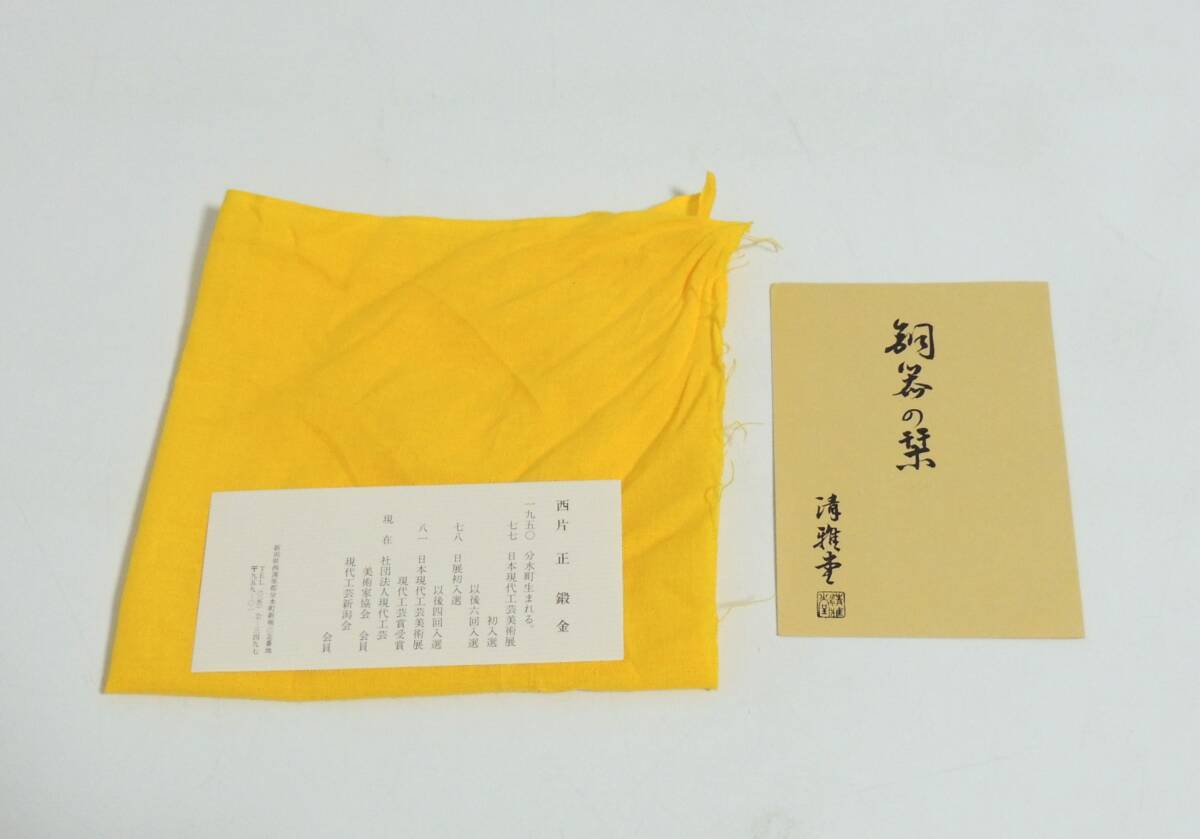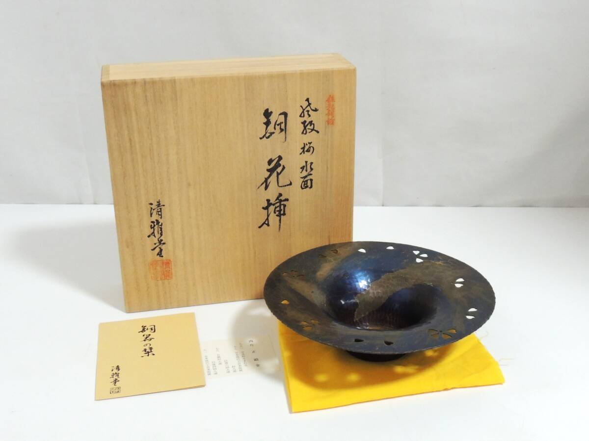 □ 鎚起銅器 銅花挿 西片正 桜水面 花器 花入 花生 花活 生花 在銘 桜透かし 金属工芸 工芸品 共箱/栞付き 経年保管品 ③ | |||||||||||||||||||