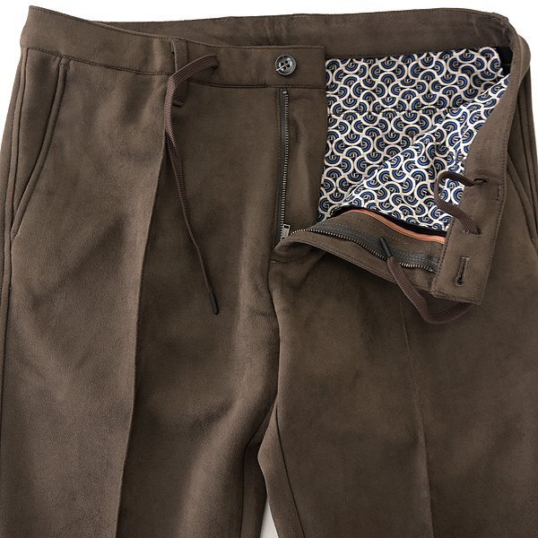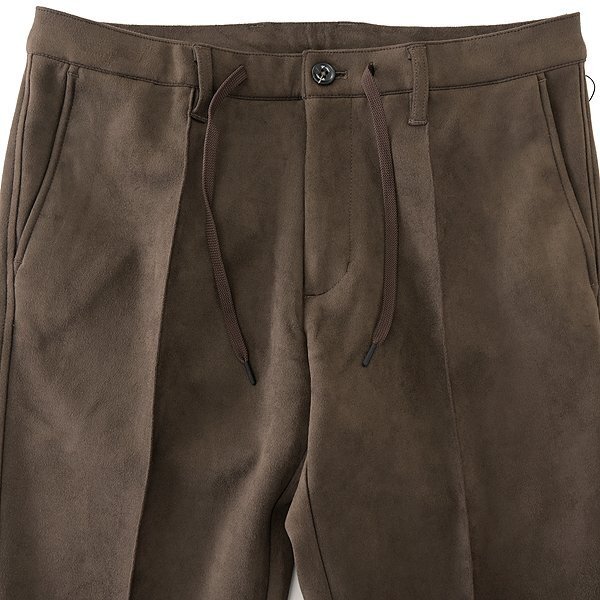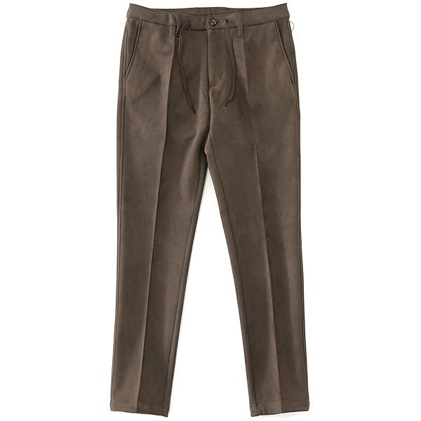 リッチな艶感と重厚感が漂うヌバック調ジャージー素材のスラックスです。 リアルヌバックのようなふっくらとした肉感のボンディングジャージー素材を使用し、重厚なルックスに相反する、快適で軽い着用感に仕上がっています。 緩やかにテーパードを描く美しいシルエットに、生地を摘まんで縫い上げるプリーツ仕上げを採用し、どんなに動いても消えない永久クリースラインでドレッシーなルックスを実現させています。 伸縮性と形状安定性に優れている素材なので、シワになりにくいのもポイントです。 滑らかな素材感と上品な光沢感で、スタイリングが大人っぽくエレガントに決まります。 ドレッシーなセットアップスタイルから、スポーティーなセットアップスタイル、ドレス&スポーツをミックスさせた時代感あるスタイルまで、シーンやお好みに合わせて多くのスタイリングをお楽しみいただけます。 同生地のジャケット(6-30203)を合わせて、セットアップスタイルも可能です。 【デザイン】 ・ノータック ・ジッパーフライ ・テーパードシルエット ・ウエストにゴムとドローコード入り |