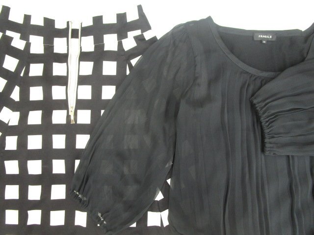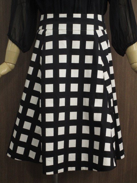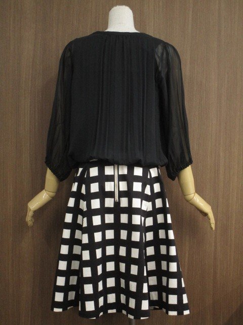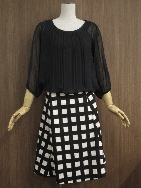 七分袖シフォンプルオーバースモックブラウス+ひざ丈フレアスカート コーディネート上下2点セット M相当 ブラック/ブラック×アイボリー チェック柄 フェミニン系 30代~40代