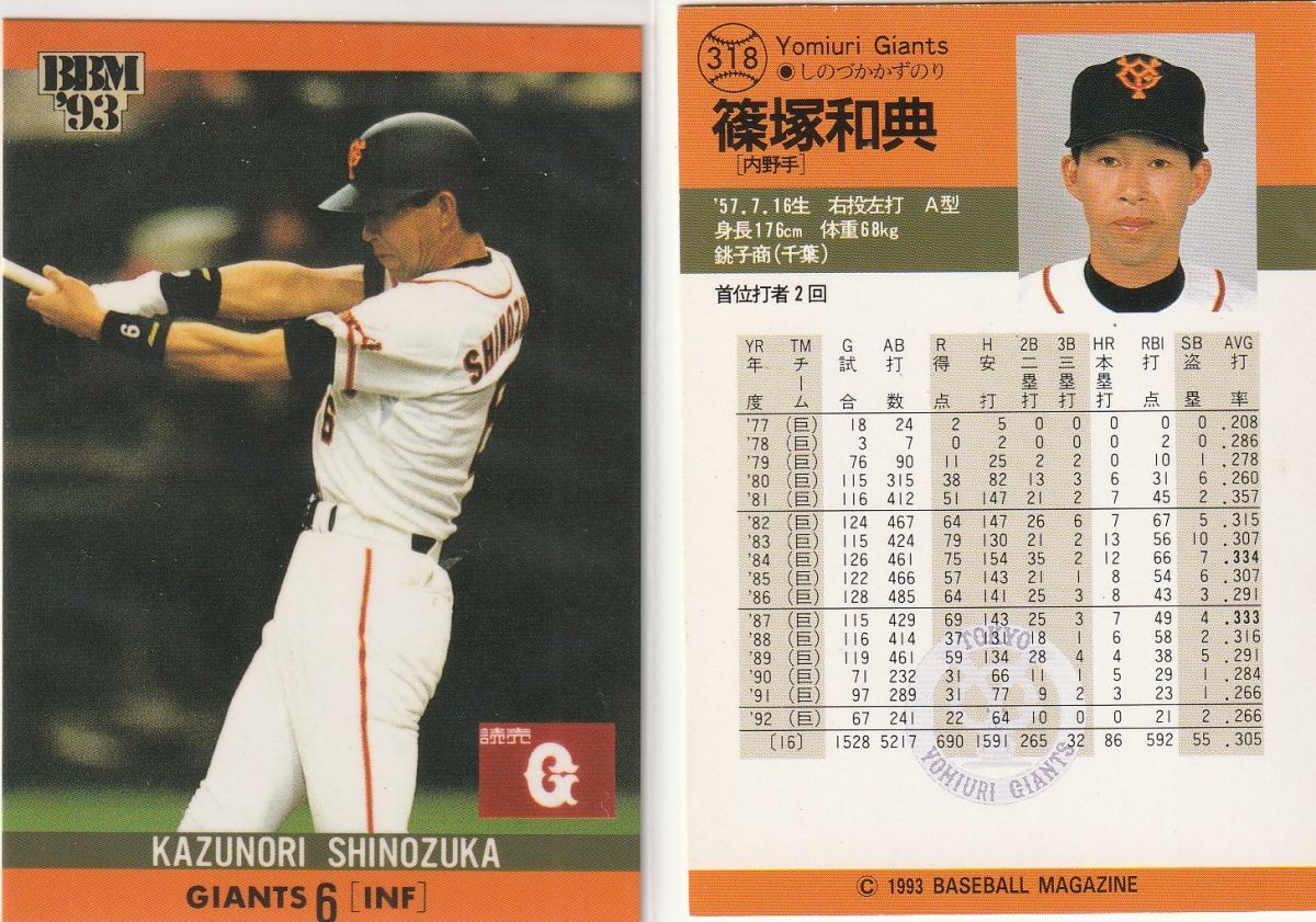 ●1993BBM【篠塚利夫/和典】 BASEBALL CARD No.318:巨人 R2