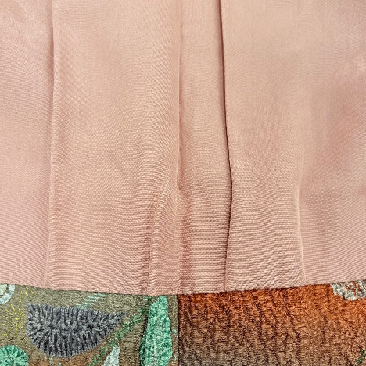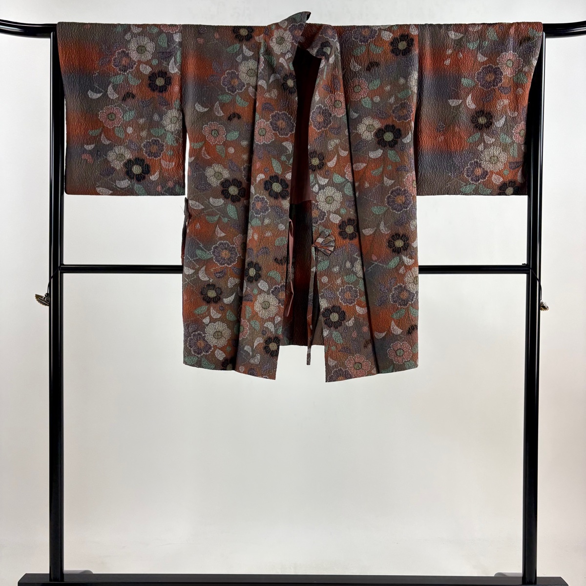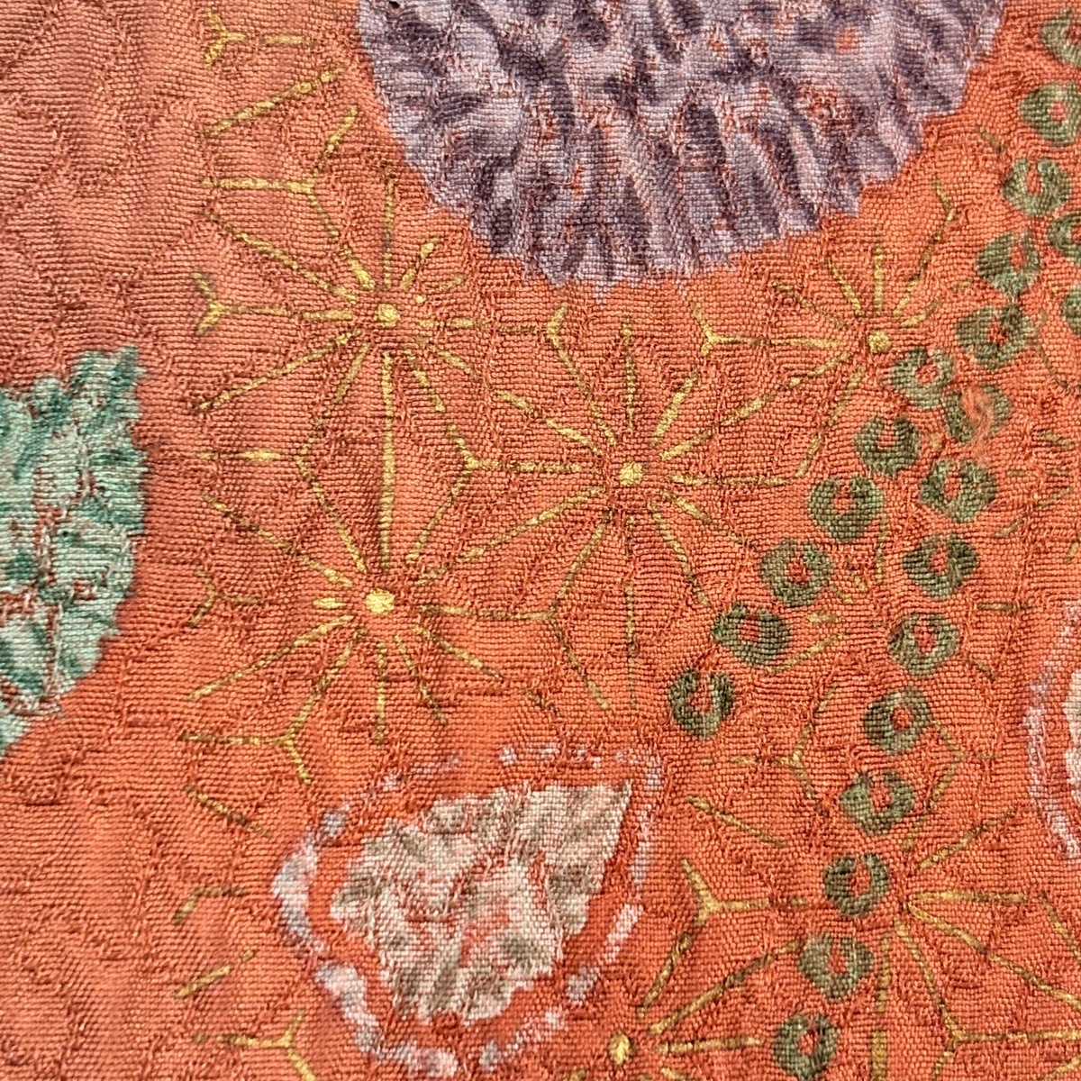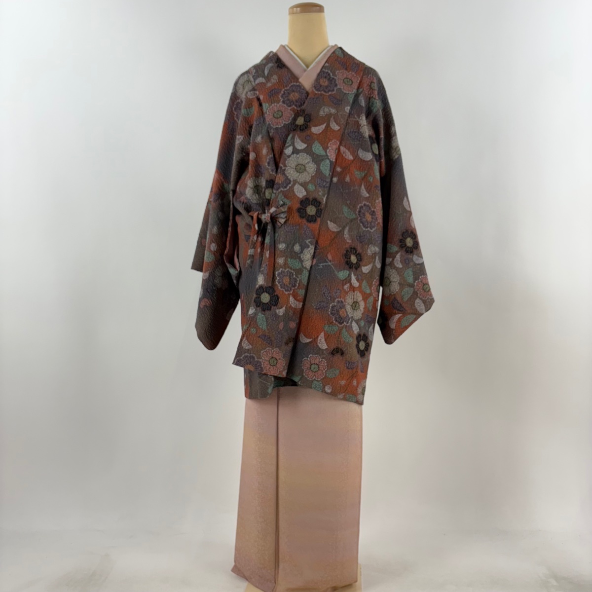 | 道中着 秀品 和装コート 桜 麻の葉 金彩 ぼかし 赤茶 身丈91.5 裄丈67 M 正絹 【中古】 |